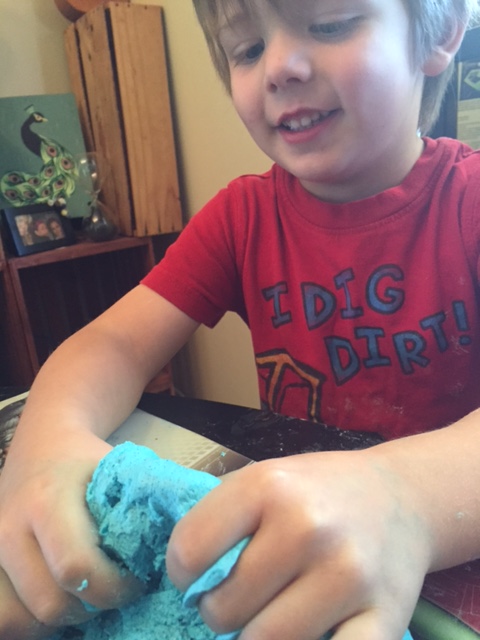 This is the basics of it, but I would like to add a bit of description for you. When you first start mixing it will be a crumbly mess. The consistency will be that of a beginning pie crust. Keep working it until it becomes a ball. If you need more moisture add a dime sized amount of conditioner, if its too sticky add a teaspoon of corn starch. By the end it should be a workable dough that has a silky smooth texture. The food dye will stain your hands but that’s kinda fun too! You could add small dinosaur figurines and do an excavation, you can add buttons or marbles for texture or a treasure hunt. Use your imagination and most of all… Have fun!