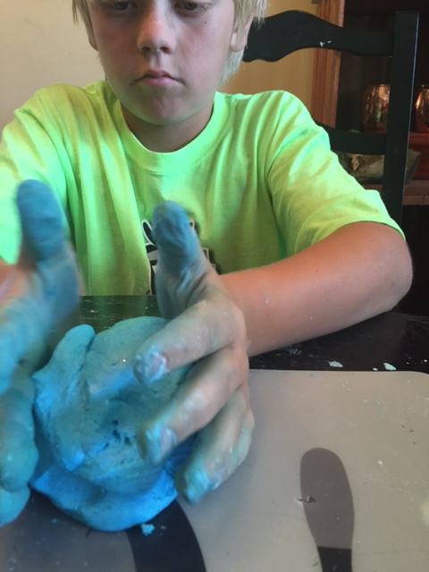 I needed to get some work done today and knew that I would be spending the day around the house. We live pretty busy lives and spending entire days at home is a rarity. I do not enjoy the cabin fever that sets in when busy kids get “bored”. So, even though they had a list of chores to keep them busy, I also wanted them to have some fun. We decided to make this odd, play dough type stuff that we are calling “Fun Dough”. We modified the original recipe by adding food coloring and black glitter. It was quick, easy and kinda messy, but that’s fun too, right?