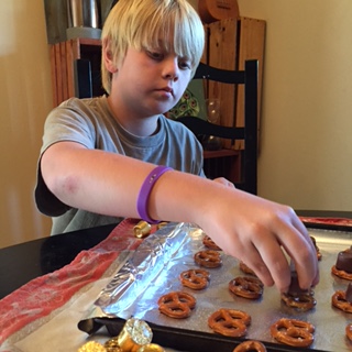 1. Place pretzels evenly spaced at least one inch apart on a foil lined greased cookie sheet. You can try it without foil but you’ll be cussing yourself out for it.