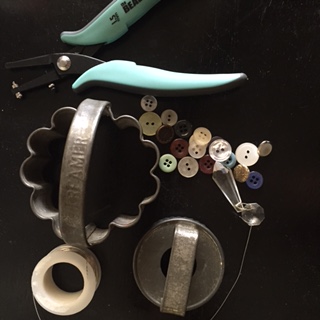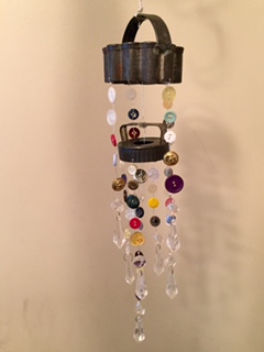 I decided to take two of the biscuit cutters and 48 (to be exact) buttons and make something cool. I used one small and one large biscuit cutter to make the beginning of my little chandelier sun catcher. I used 28 gage silver wire and a handful of found chandelier type crystals that I was saving for a rainy day. The tools I used were a metal punch and needle nosed pliers.