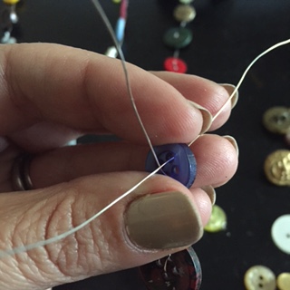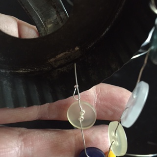 Next, attached lengths of wire first to the crystals and then threaded the buttons on evenly, leaving about two inches on the end for fastening to the cutters. I used five buttons on each of the outer strands. I made one longer strand with eight buttons and left extra wire on the end opposite the crystal.