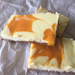 Randomly drop small spoonfuls apricot puree on cream-cheese mixture. With a skewer or thin-bladed knife, gently swirl puree. Bake just until set, about 25 minutes. Let cool slightly in pan on rack, then refrigerate until chilled and firm before cutting into squares, 2 hours.