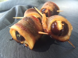 - Wrap each stuffed date with half a strip of bacon and secure with a toothpick