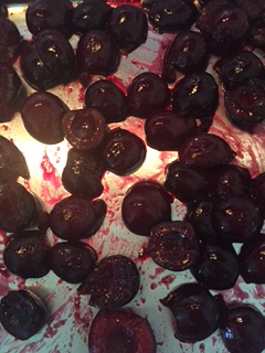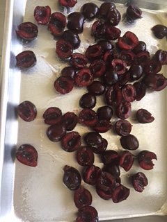 - Lay cherries out in an even layer on a lightly greased baking sheet and place into a 400 degree oven for 15 minutes, tossing them every five minutes. remove and allow to cool.