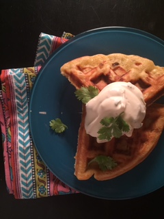 You can serve up an entire waffle if you like, but I served half and spooned a generous amount of the creme fraiche on top. This portion size would be an ideal appetizer for two. I really enjoyed this recipe. It had a nice south-western flair to it and was just special enough with the creme fraiche to feel kinda fancy, yo! I hope you enjoy it!