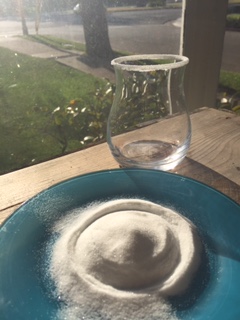 - Pour a circle of sugar about the size of the rim of your glass onto a dessert plate.