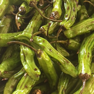 - Toss whole peppers, stems on, with soy sauce mixture until coated. Arrange on a lightly greased baking sheet and place in a 450 degree oven for 20-30 minutes tossing every five minutes or so. They should be blistered and shriveled looking and starting to char.