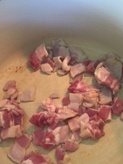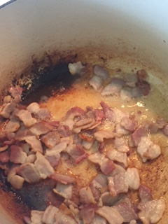- In an oven safe Dutch oven, cook bacon crisp until all fat is rendered. Remove bacon and set aside, leaving fat in the pan.
