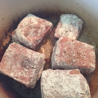 - Liberally salt and pepper the short ribs and then dredge in flour until completely coated.