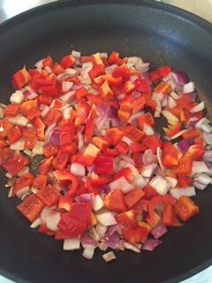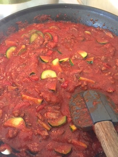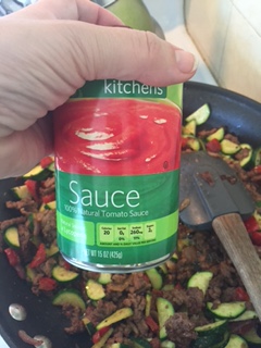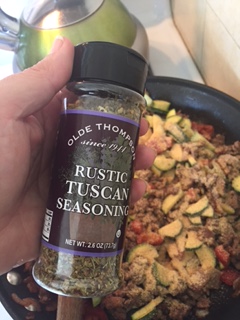 - Sautee onions and bell peppers in a hot skillet with a bit of olive oil over medium high heat. Once soft add garlic and ground meat and seasoning. Cook until browned. Add zucchini.Â