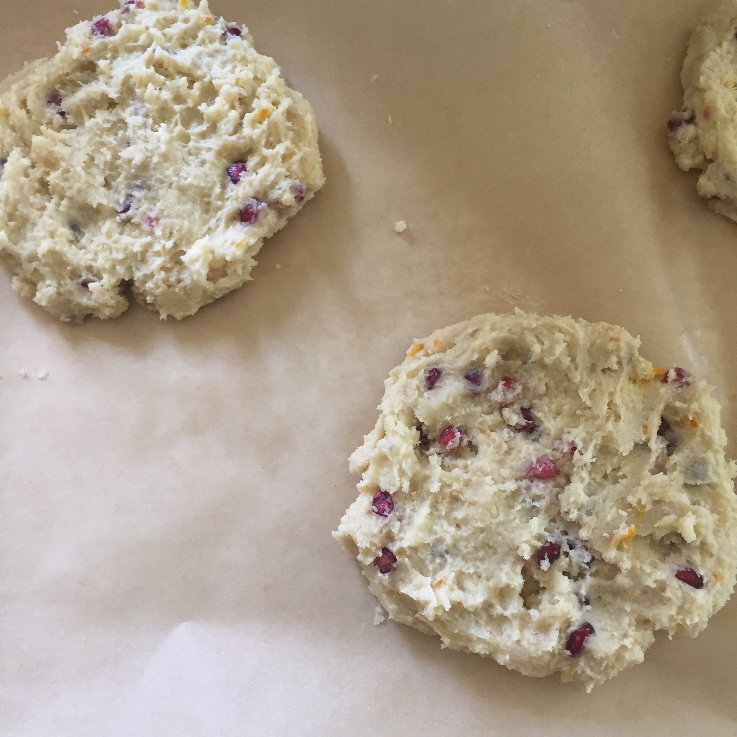 7. Roll into 6 balls flattened into disks. Place them on a parchment lined baking sheet several inches apart. I managed about three per sheet.