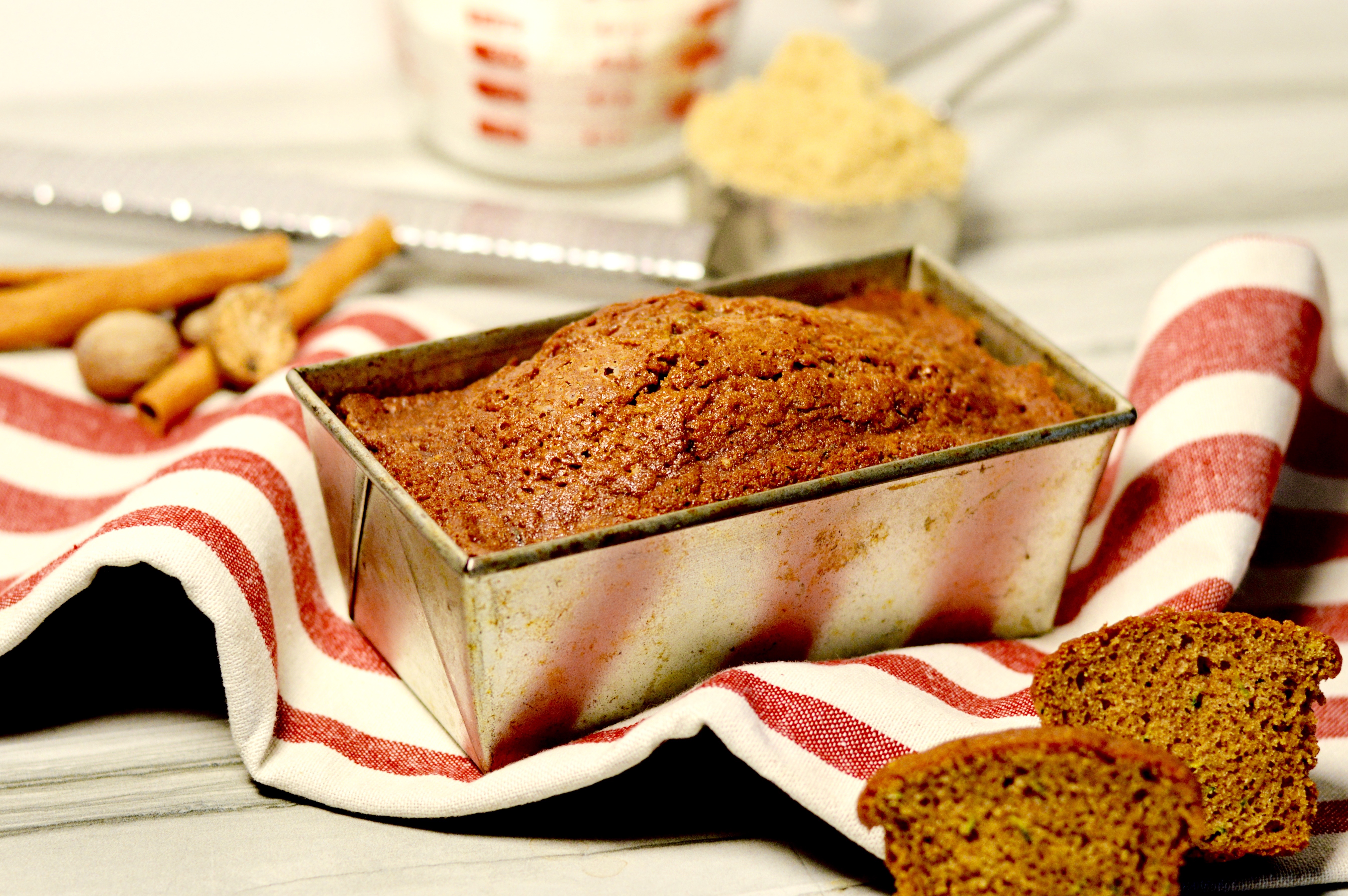 Every year my mom, aunt and grandma would gather during the holidays and have a baking/candy making extravaganza! It was a sight to behold and the sheer volume of their goods was enough to feed an army. The yield from this day known only as “Candy Making” has been a staple in my holiday life since I can remember. I will be writing more about this closer to the holidays and will be going deep into the generations old tradition then. For now, I had zucchini that needed using and decided to make some bread! The recipe I used is similar but, I used brown sugar and more spices. I think my grated zucchini ratio is higher as well.