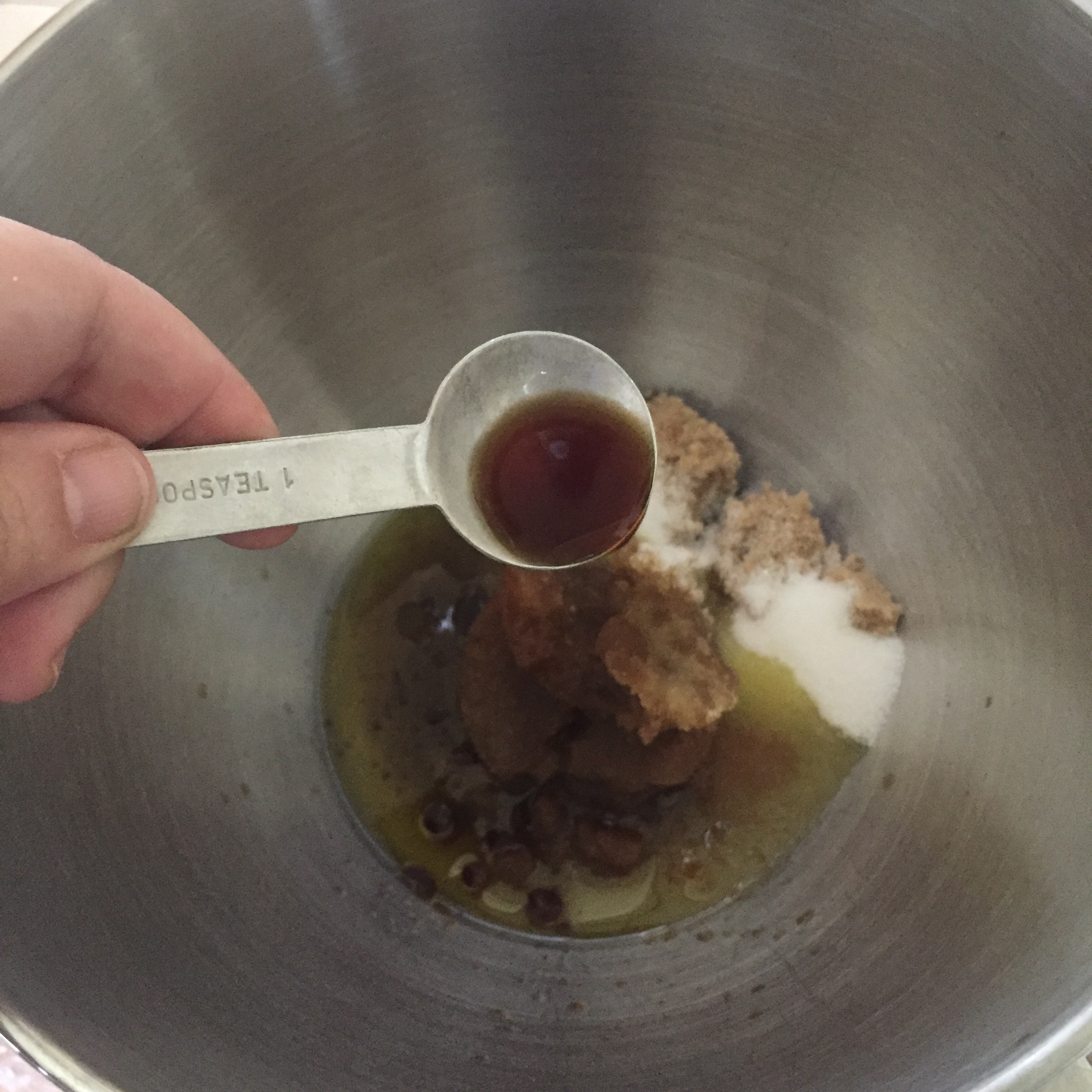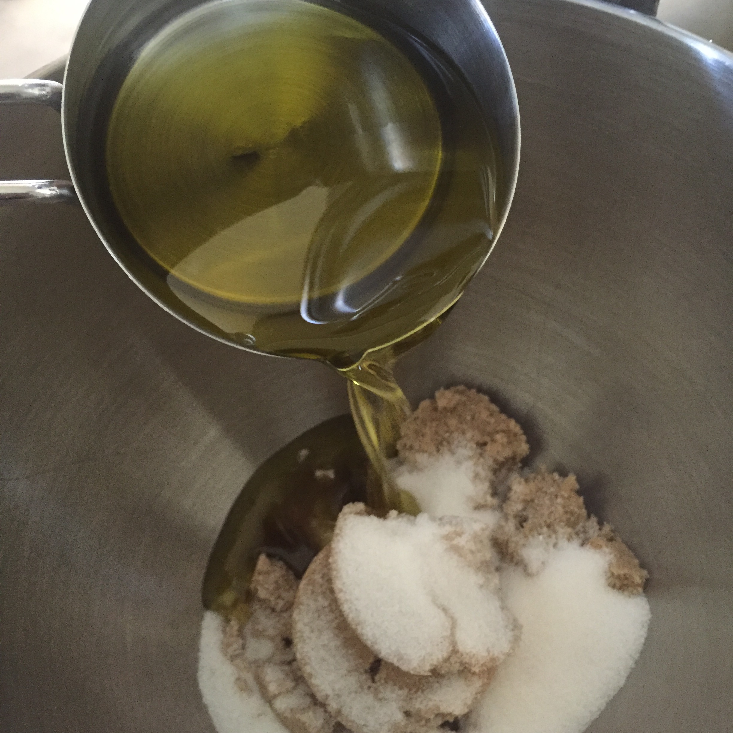 - In a large bowl (0r the bowl of a stand mixer), whisk together the sugars, oil, vanilla and eggs.