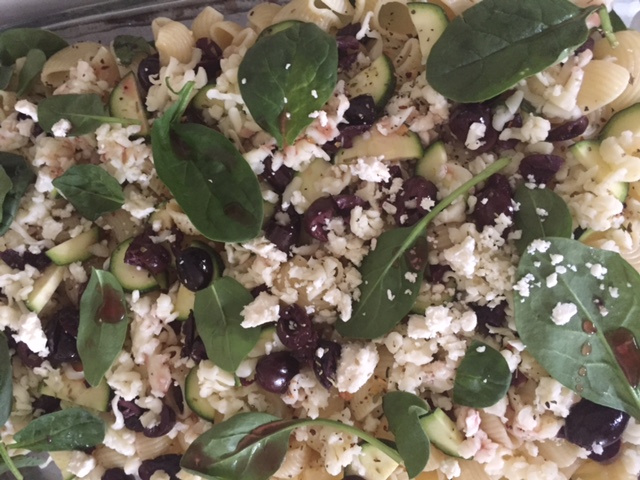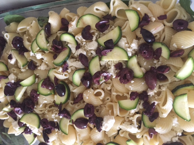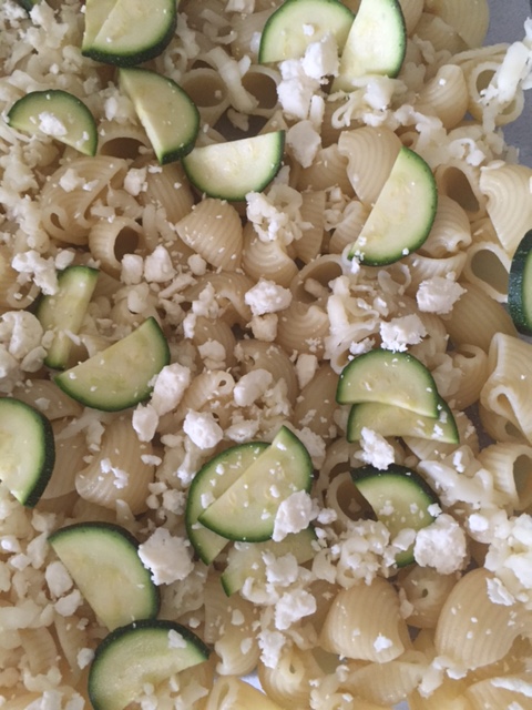 1. Set your water to boil and your oven to 400 degrees. Cook pasta according to package directions. Chop olives, grate cheese and slice zucchini while waiting.