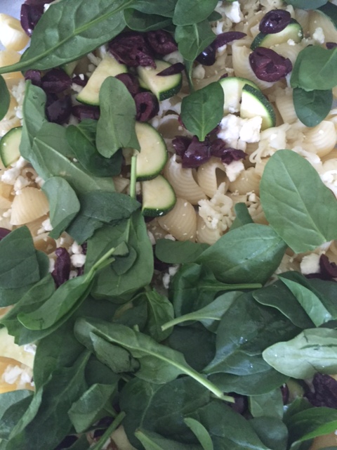 2. Once pasta is aldente, drain and pour half into a greased 9×13 baking dish. Top that with half of each cheese, half of the zucchini, half of the olives and 1.5 cups of the spinach.