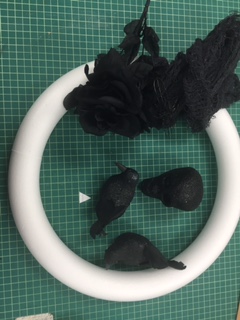 Gather your items and begin by either painting the wreath form or coving it with fabric using hot glue.