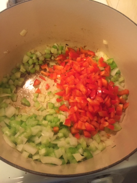 1. In a large pot, saute onion, celery and bell pepper until soft. Add minced garlic and cook another minute or two.