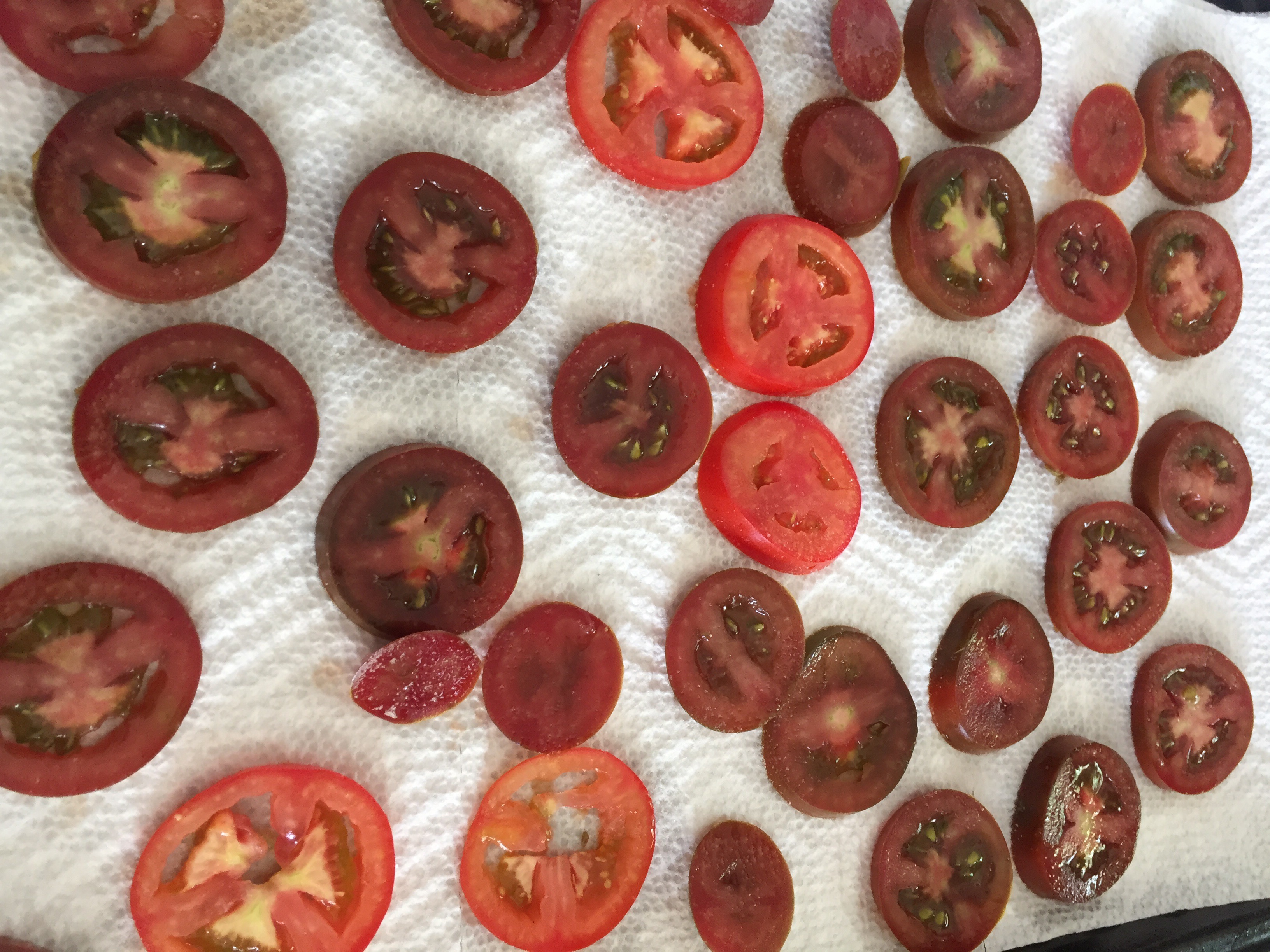 2. while the crust is baking, line a baking sheet with paper towels and lay the tomatoes out evenly. Salt liberally and allow the moisture to weep. After about 15 minutes, blot the excess liquid away with more paper towels.