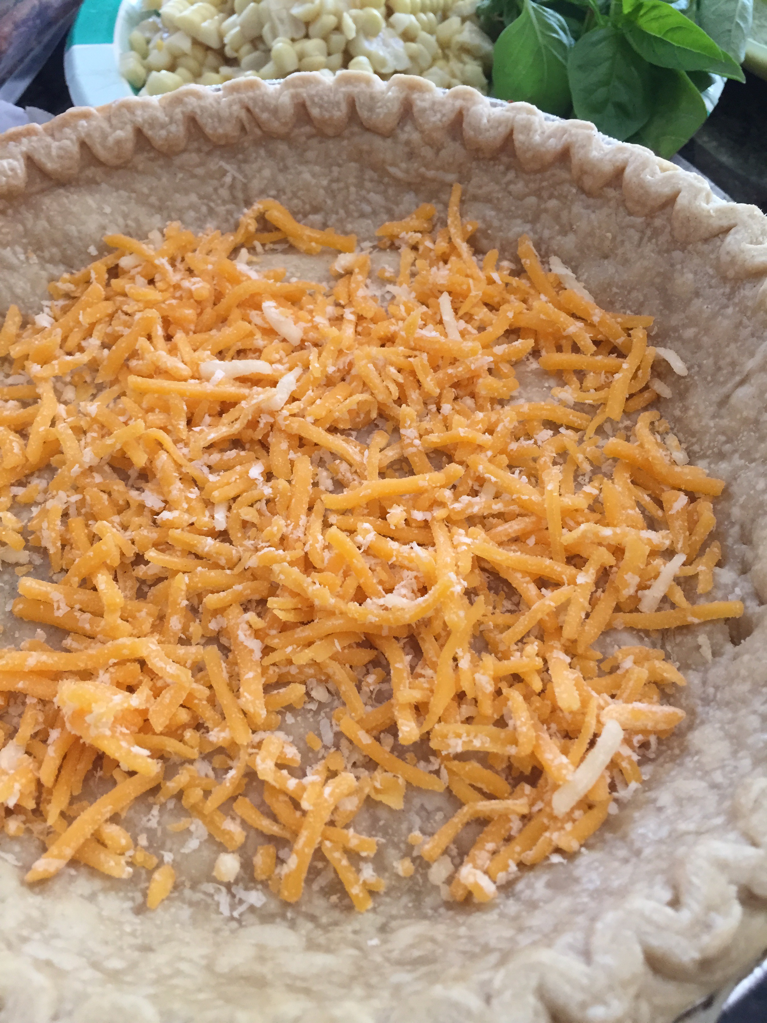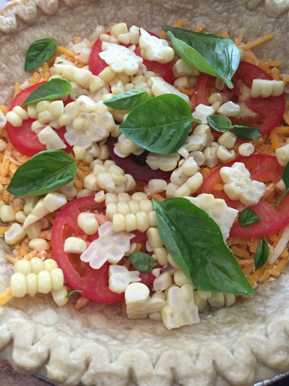 These “pop up” house concerts are very popular right now. Maybe they’ve always been? I seem to be seeing quite a few these days. We were invited to one in Venice this weekend and it was lovely. It was a smallish house that was unassuming from the front but was an absolute burst of color, texture and miss-matched treasures inside. Likewise the back yard/music venue was a menagerie of oddities shoved into trees, random signs, vividly painted walls and Christmas lights. The grass was dead and there were stacks of boxes and items that should have been discarded littering the corners… I felt right at home. The crowd was also right up my alley. An eclectic group of hippies, retired models, famous (or maybe infamous) groupies from the days when that was a “thing” (think Penny Lane in almost famous) and a variety of former misfits who had clearly found their tribe and in it, themselves. These strangers were my people. My boys were the only children there and we were flooded with compliments on their good behavior. They’re used to being at music events and equally used to being around adults who don’t feel obligated to entertain them. The compliments were still very nice to hear! It was pot luck and like a proper swearing mom, I did not come empty handed! I couldn’t decide between savory or sweet. So… I brought both. I made a fantastic cookie which I will share separately. Today’s post will focus on the savory dish, Tomato Corn Pie. The ingredients are simple and the end result tasted like summer! This recipe makes two pies. Don’t halve it, make them both. They WILL be eaten.