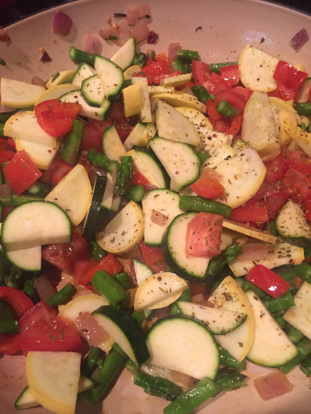 - While your pasta is cooking, begin to saute your vegetables in a few tablespoons of olive oil. Start with the onion and bell pepper, as they will take the longest. Once the onion is transparent, add the asparagus and cook for about a minute. Next add the tomatoes, zucchini and squash.