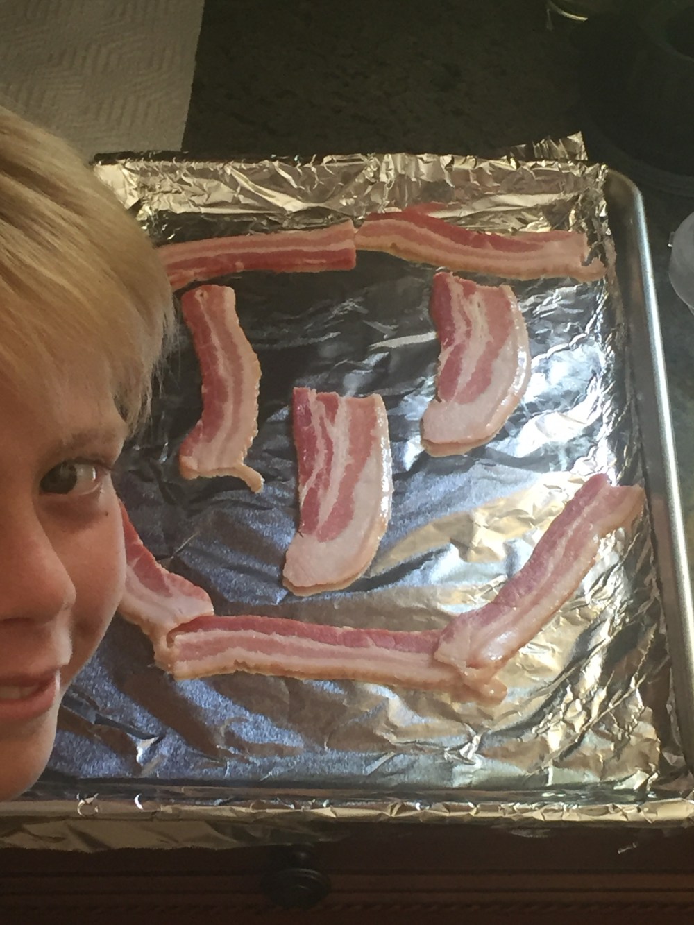 1. Line a baking sheet with foil and spread the bacon strips out evenly. Place in a 425 degree oven for about 15 minutes or to the doneness that you prefer. If lining the pan evenly isn’t your thing, try a happy face!