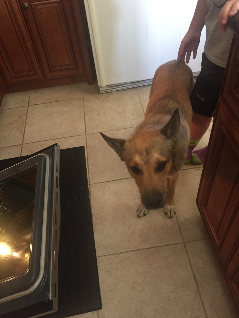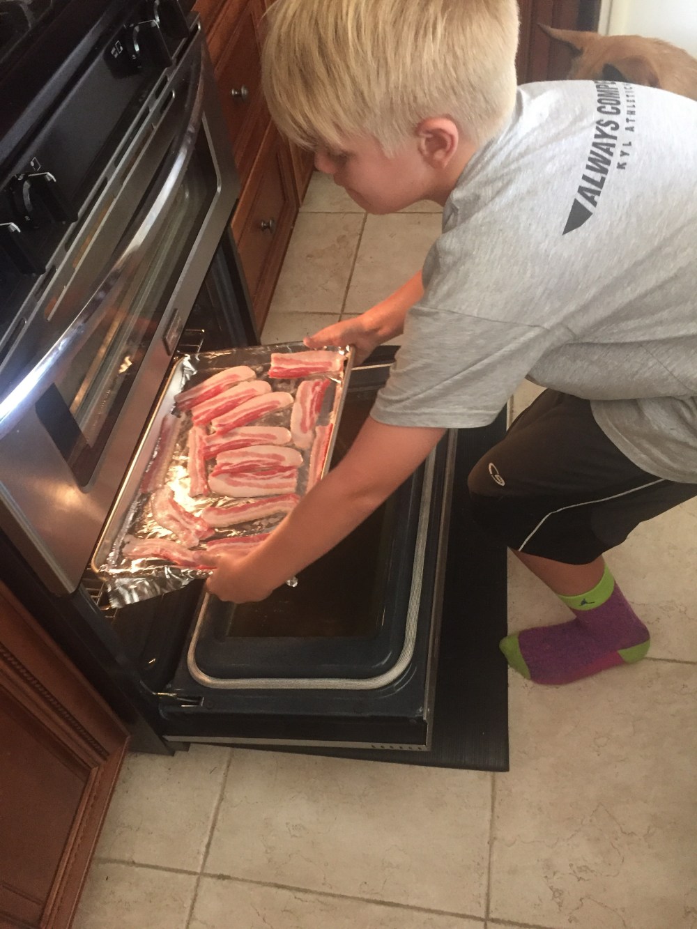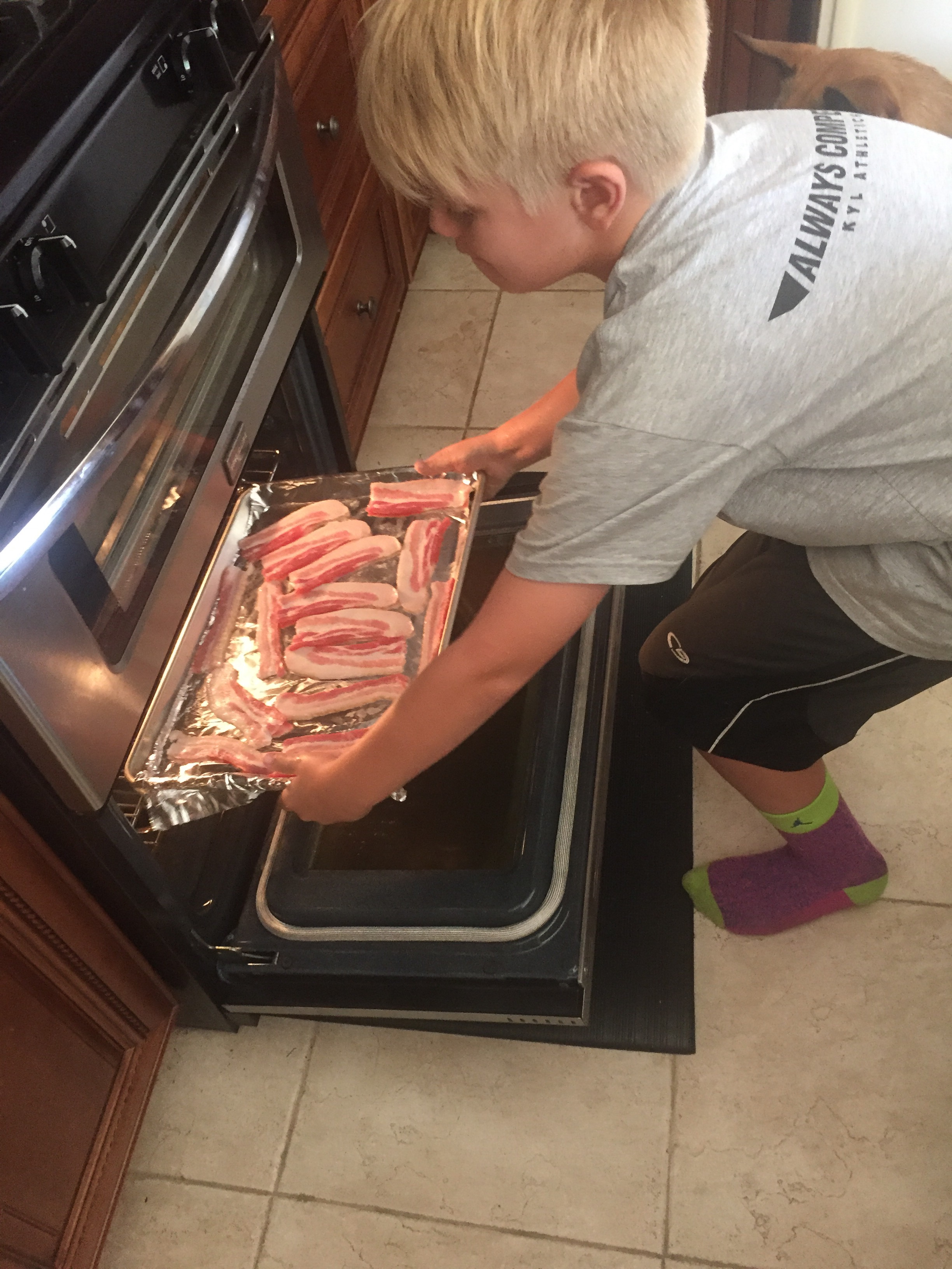 Enzo is hoping for a dropped piece of bacon!