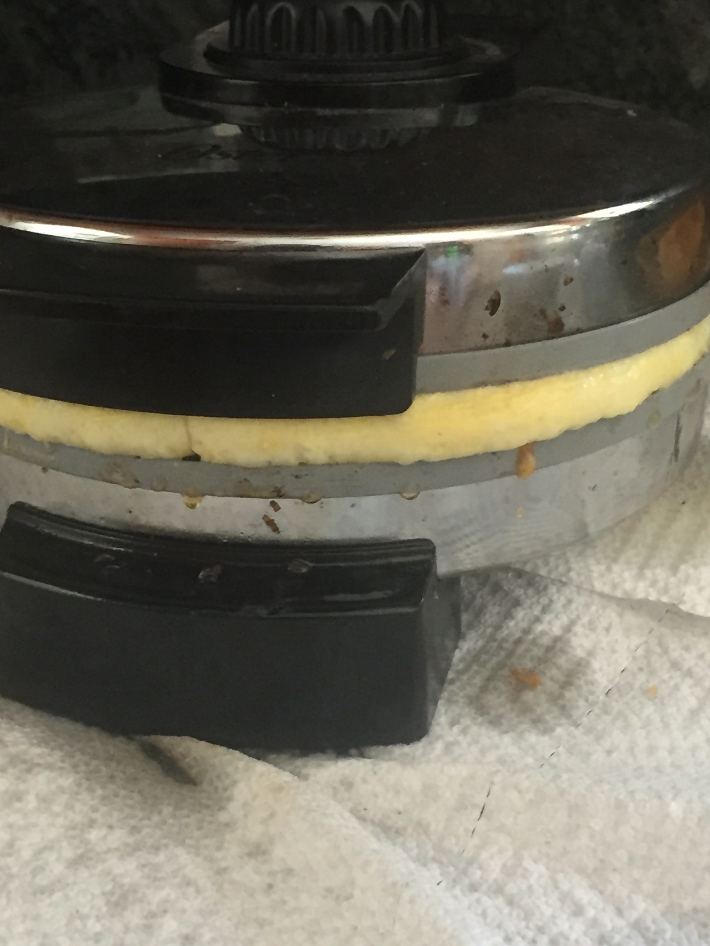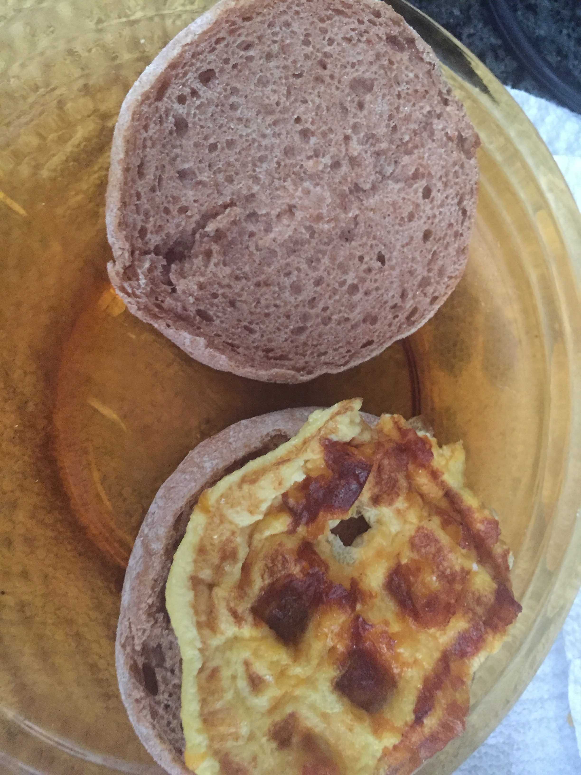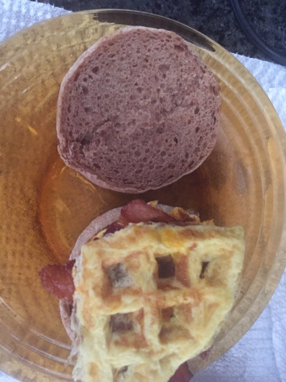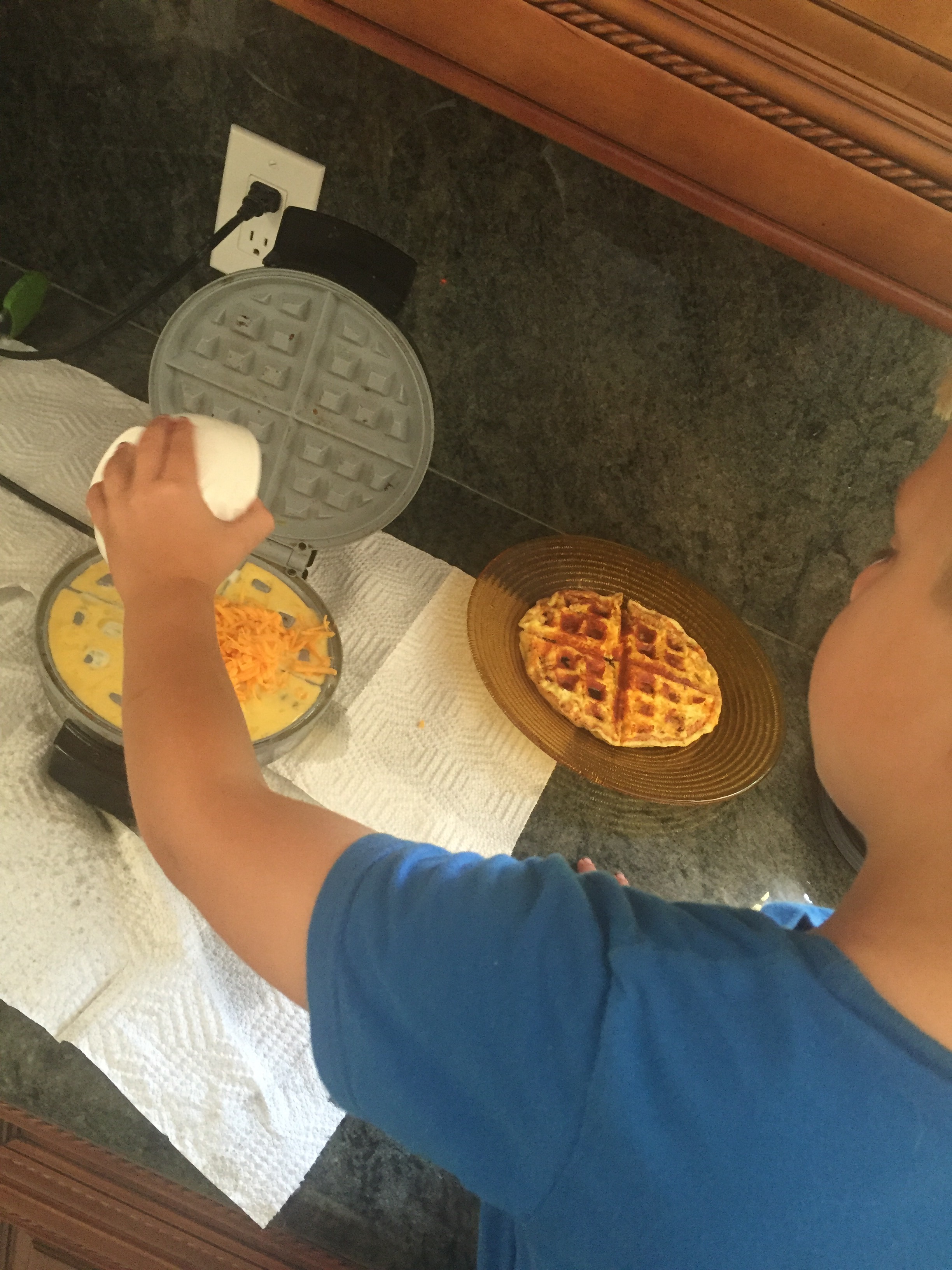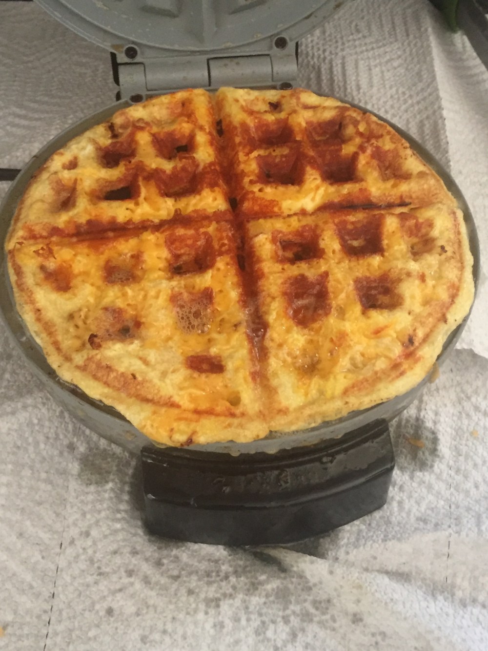 3. Turn your waffle iron on high and allow to come to full heat. We cooked our eggs in the waffle iron, this is not required, but I found that the triangles (we have a round waffle iron) are the perfect size for the English muffin. Once fully heated, add about a half cup of the beaten eggs and sprinkle about a half cup of cheese on top. Close the iron and let cook. It will puff up a bit. When the cheese is crisp (YUM) the top will release easily. Remove the waffle to a plate and continue until you’ve used the eggs and cheese. You should end up with six egg waffles, enough for 12 sandwiches.