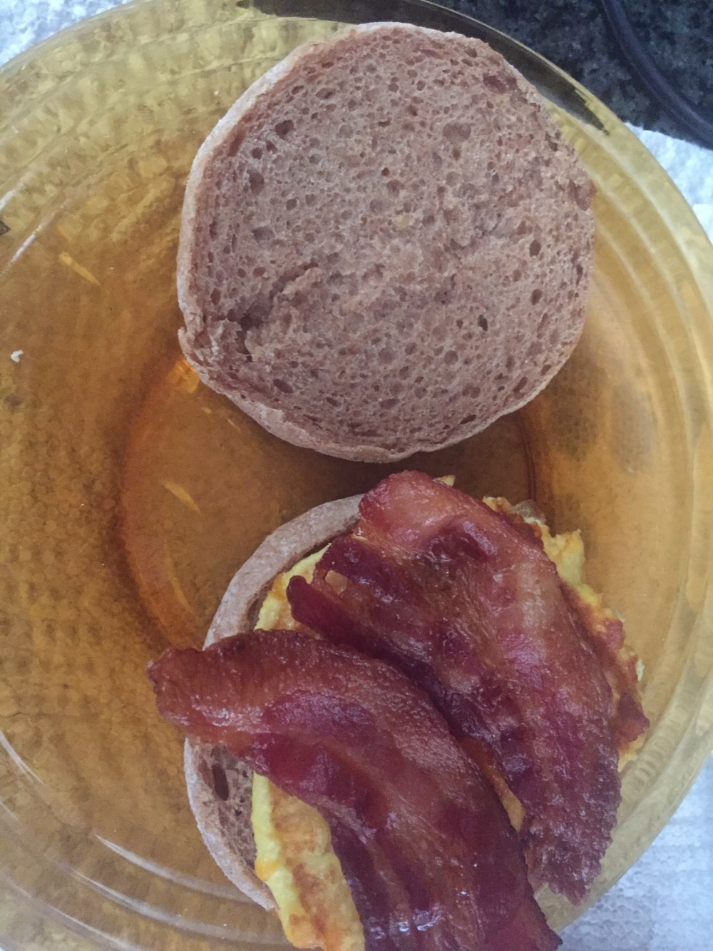 4. Toast your muffins. Next, assemble! Muffin, egg triangle, bacon, egg triangle, muffin, repeat! Feel free to add mustard or mayo or butter if you like, we found that these sandwiches didn’t need it! Just heat in the mircrowave when ready to eat and voila!