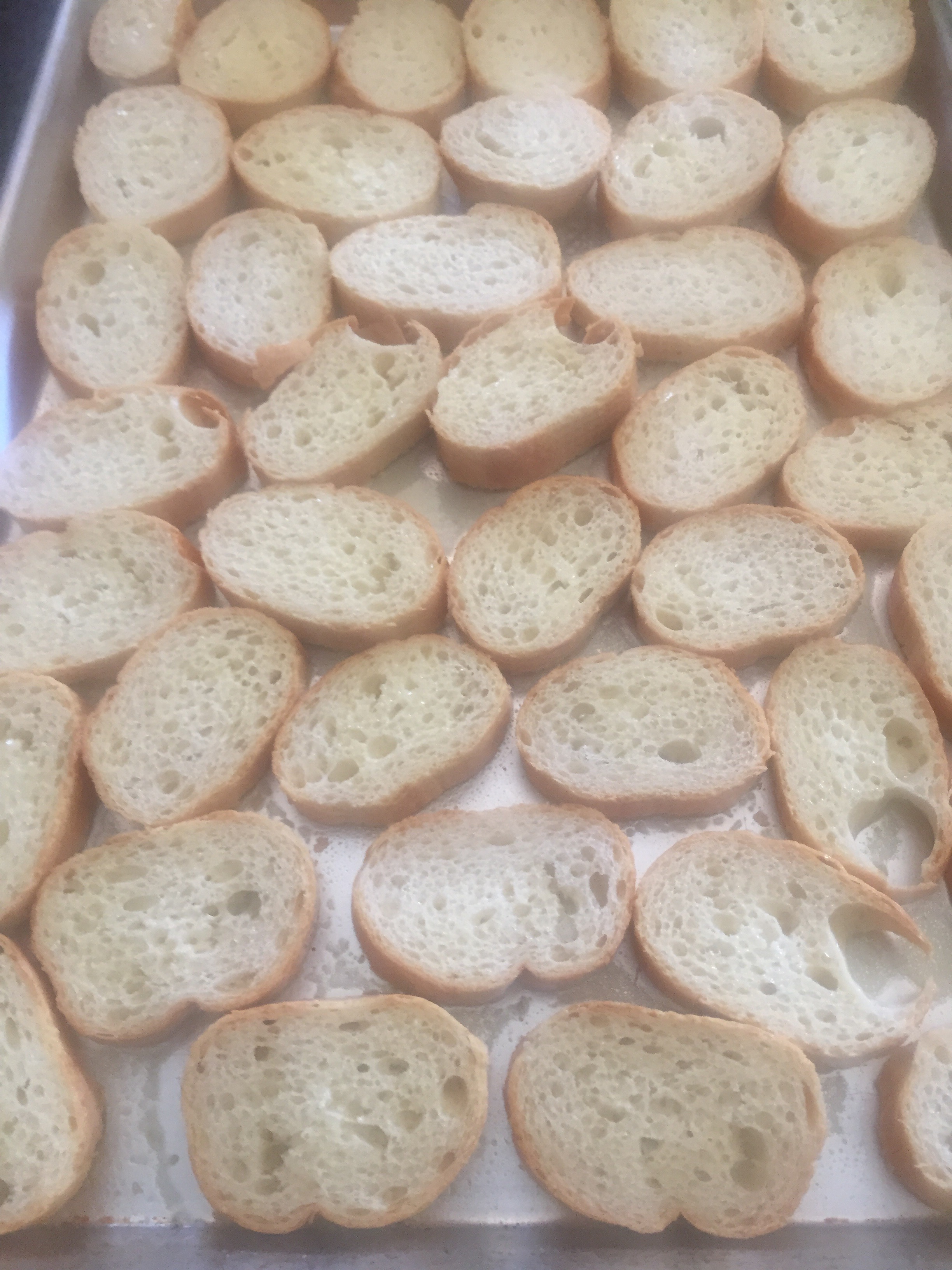 - Slice your baguette in rounds about a half inch thick. Lay them in a single layer on a large cookie sheet and drizzle with olive oil. Sprinkle with garlic and salt or garlic salt and pop into a 425 degree oven for 8-10 minutes. Traditionally the bread is hand rubbed with garlic, but I don’t have time for that shit. IJS