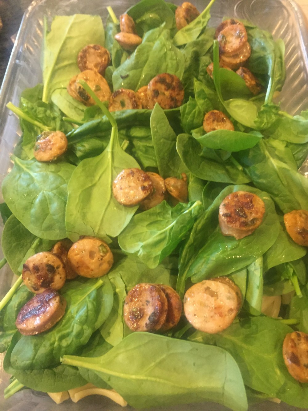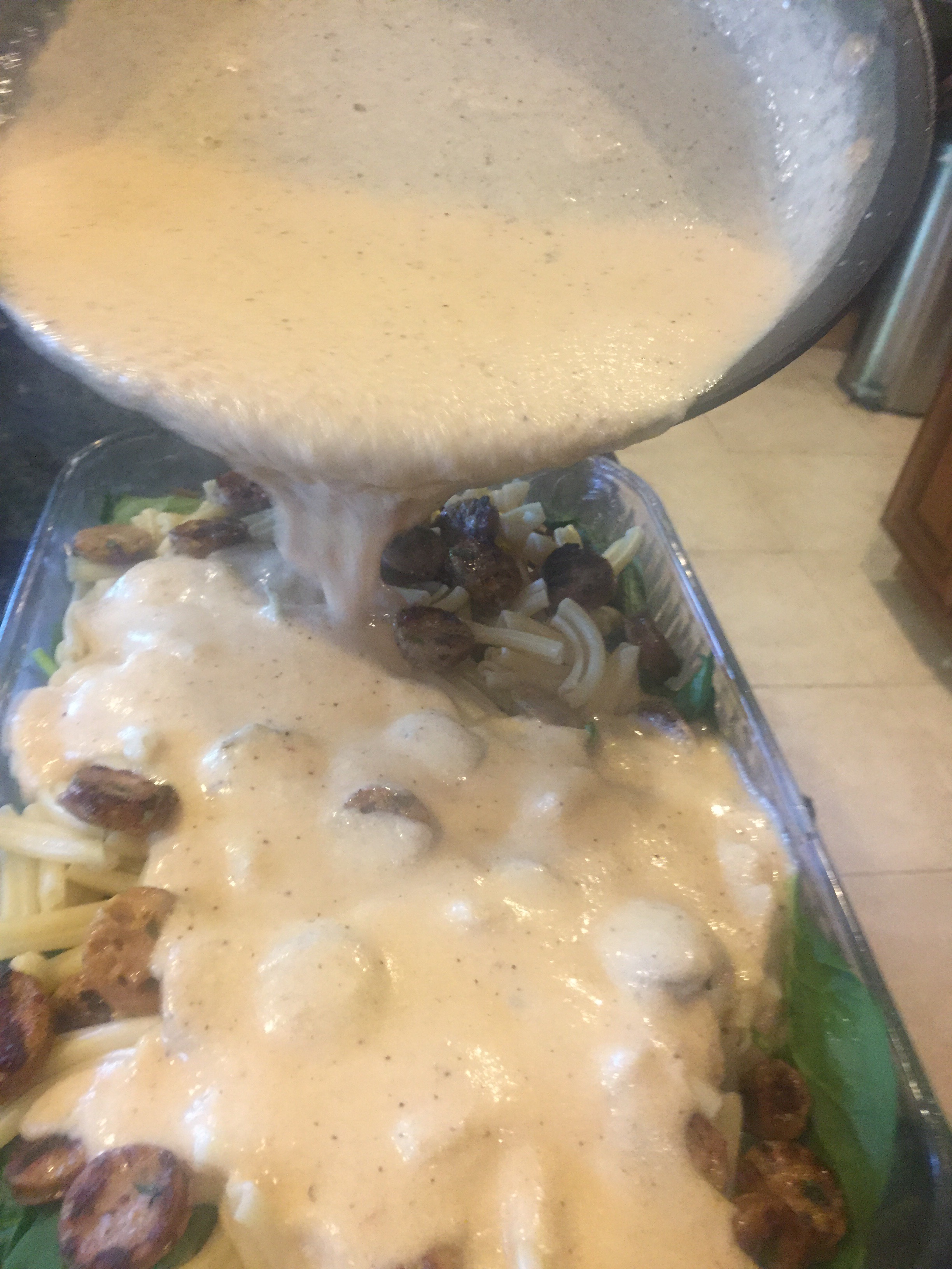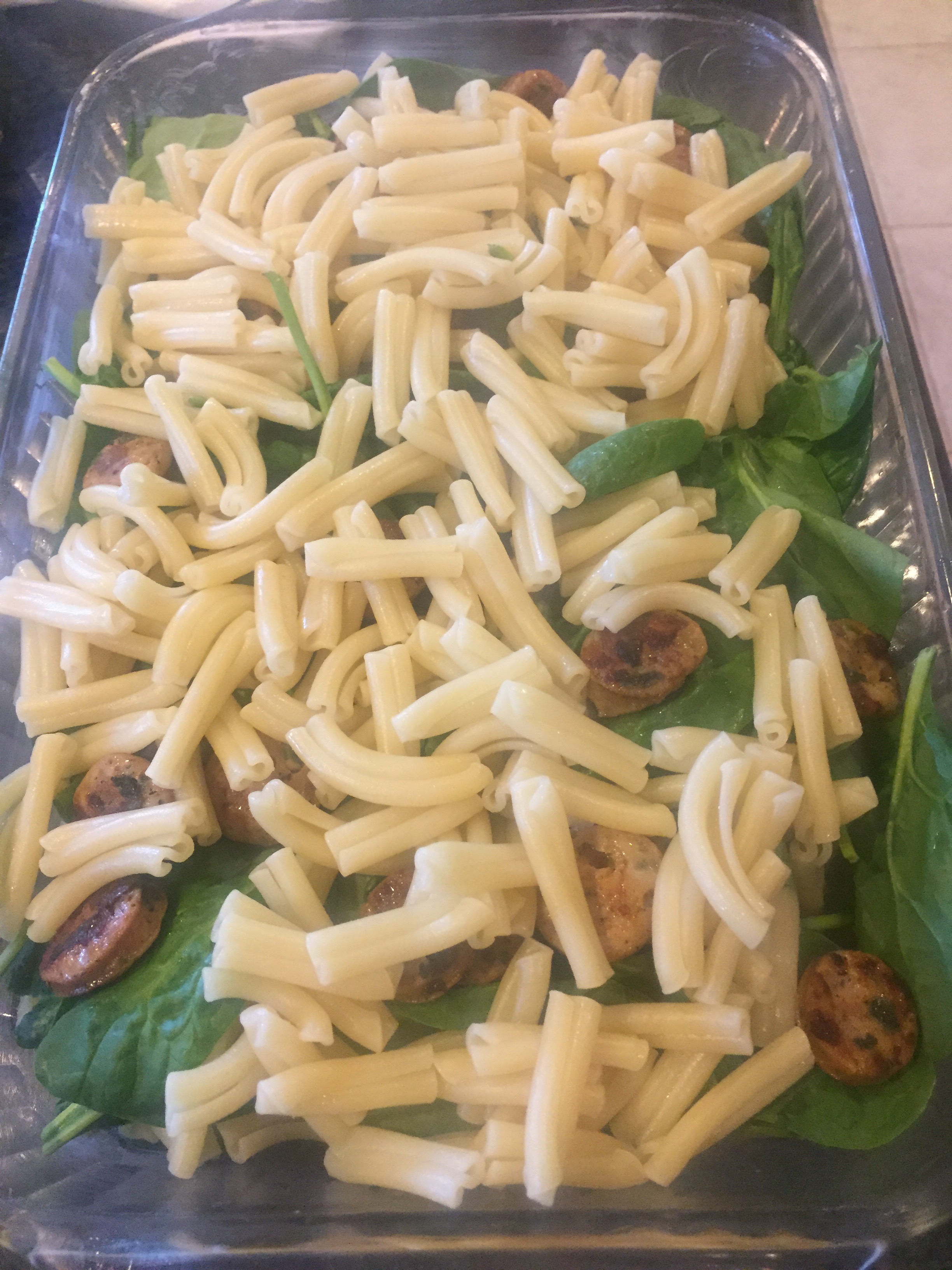 - Pour half of your pasta into a greased 9×13 baking dish. Next, layer on all of your fresh spinach, followed by half of the sausage. Repeat with remaining pasta and sausage.