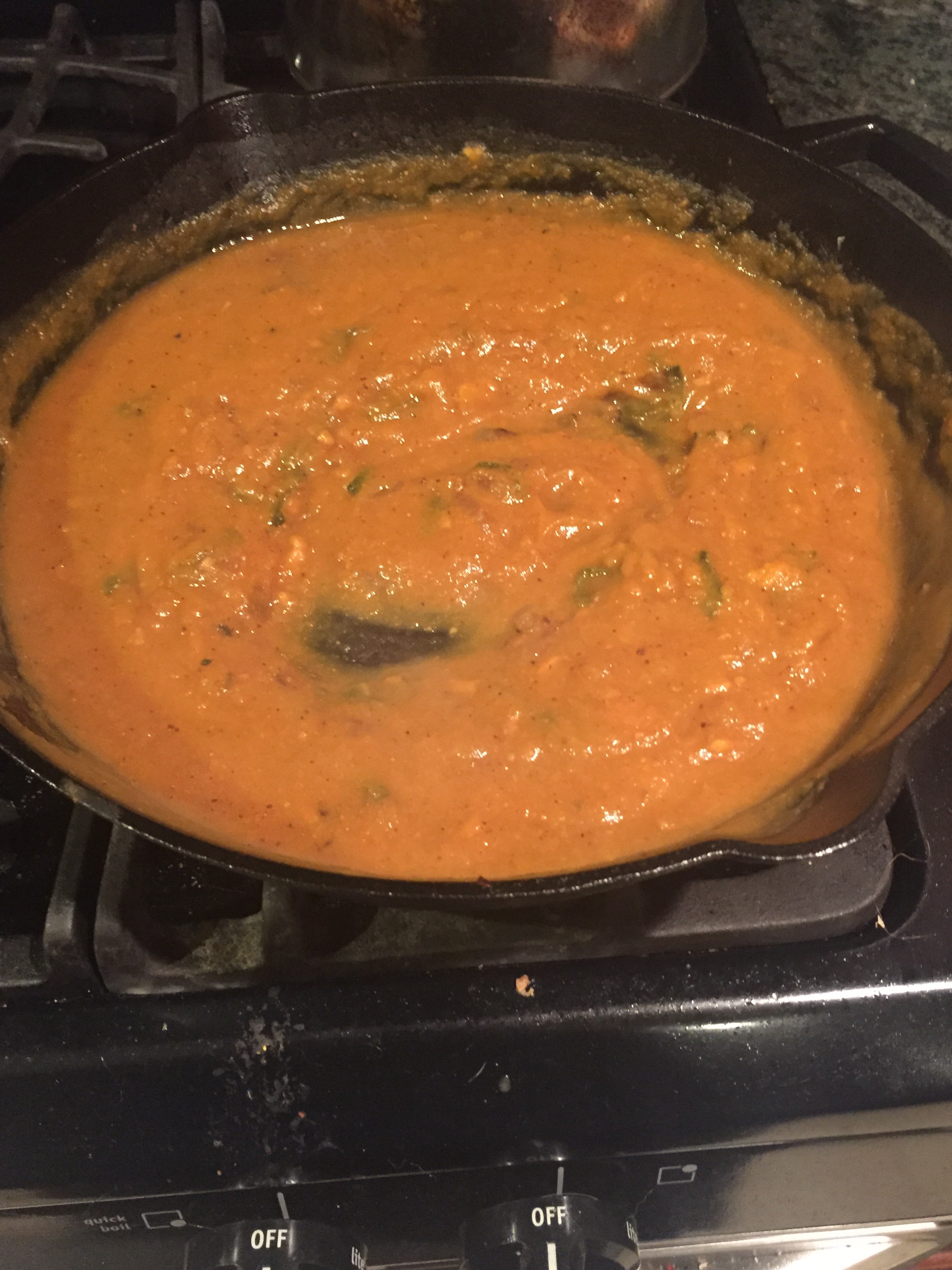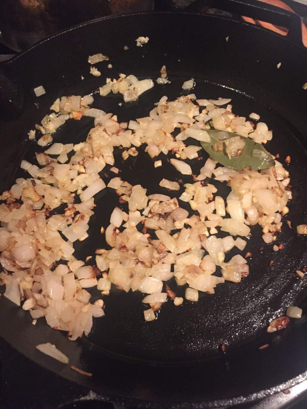 - In a large cast iron skillet, add a bit of olive oil and sautée your onions until transparent. Add garlic and bay leaf, cook one minute more.