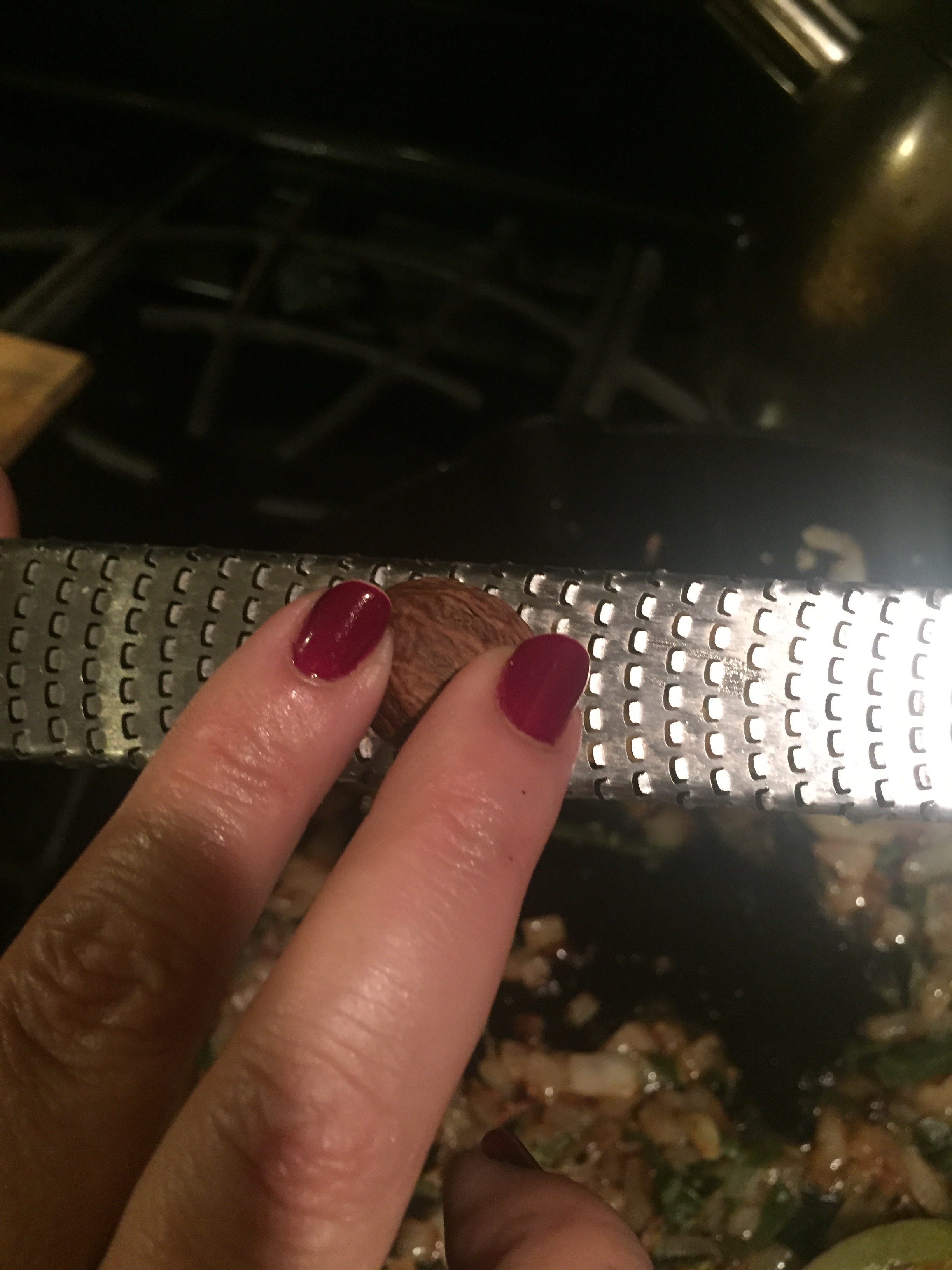 - Add nutmeg and sage, reserving a bit to sprinkle over the top, add wine. Cook over medium until wine reduces to half, about 4 minutes.