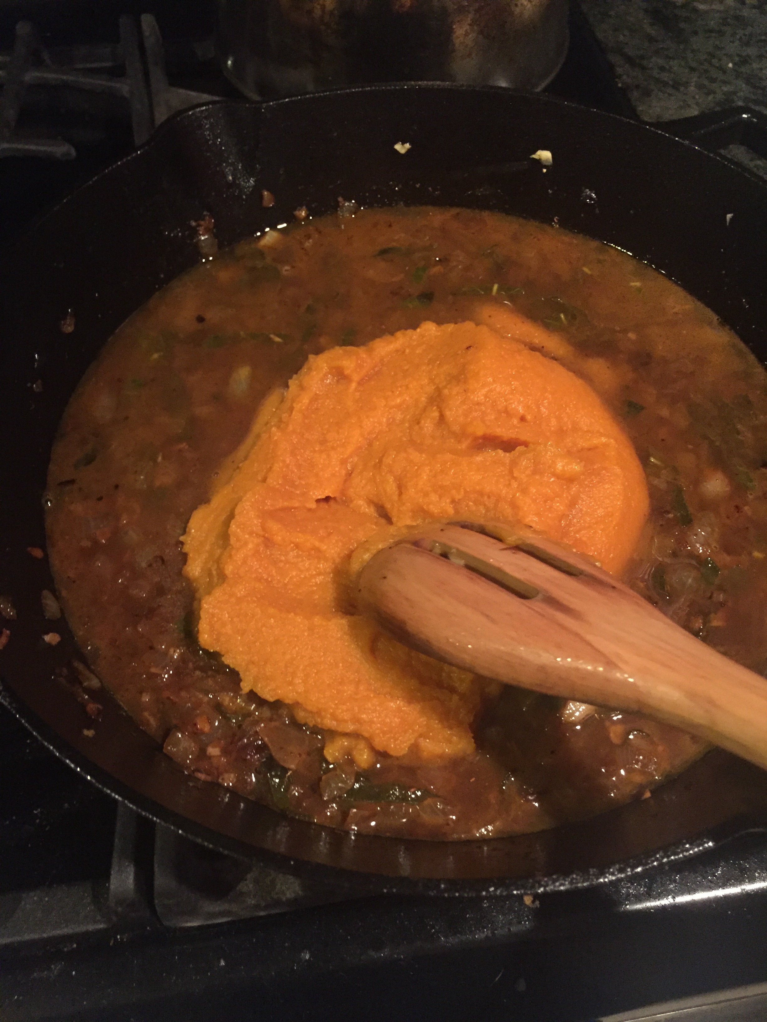 - Next add your pumpkin purée and thoroughly combine. The sauce will become thick quickly. S&P to taste.