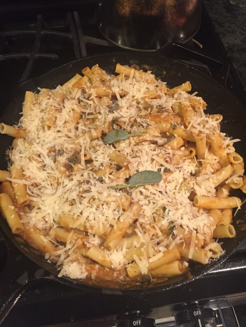- Pour the sauce over your pasta and mix well. Return the pasta to the skillet, sprinkle Parmesan cheese over the top and sprinkle remaining sage.