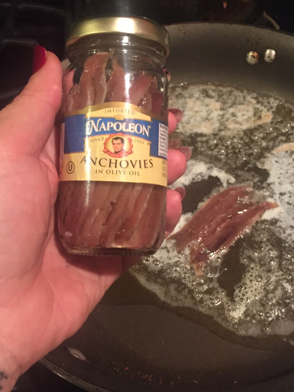 - In the same large skillet, melt butter into the olive oil over medium heat. Add the anchovies.