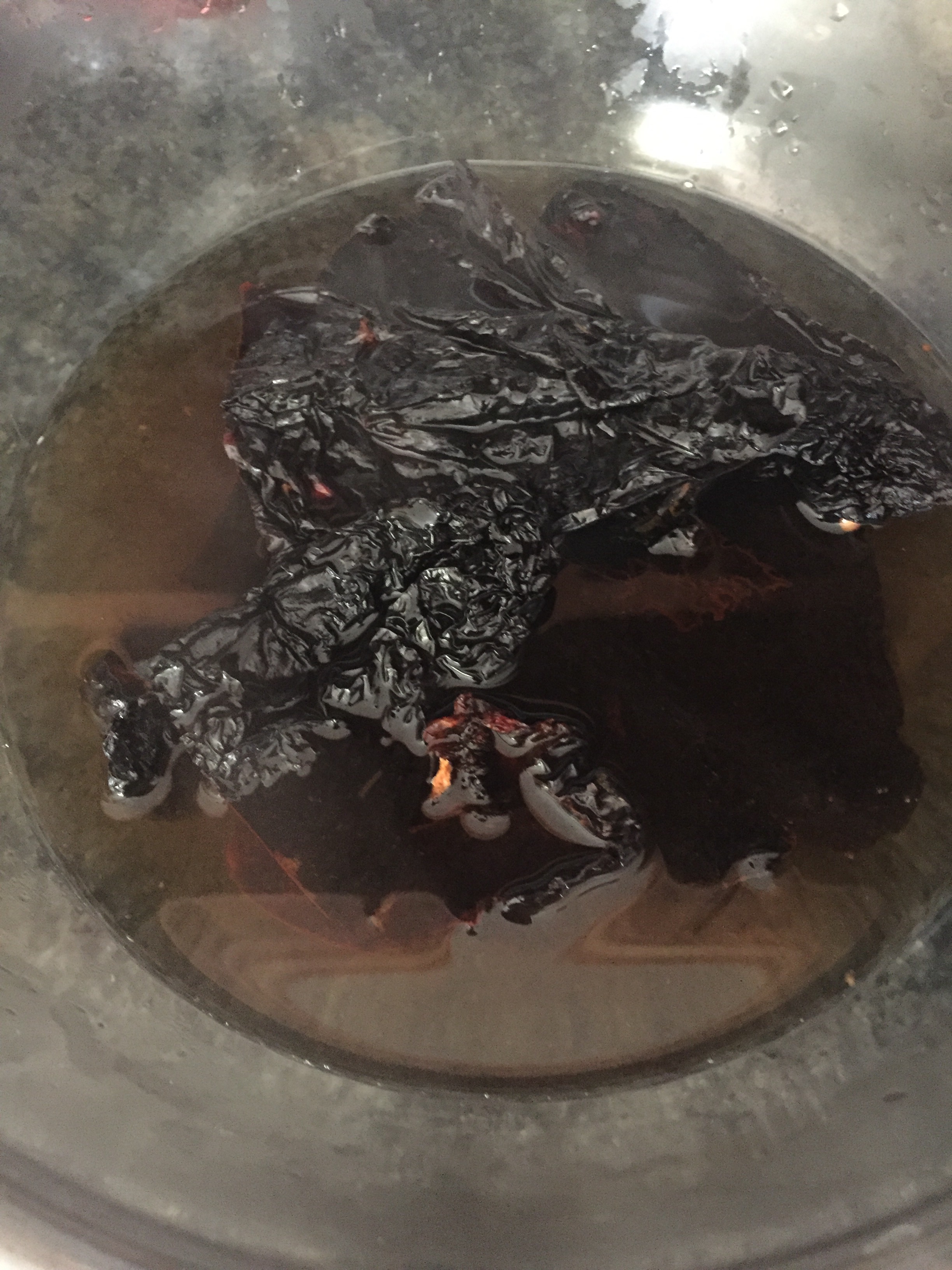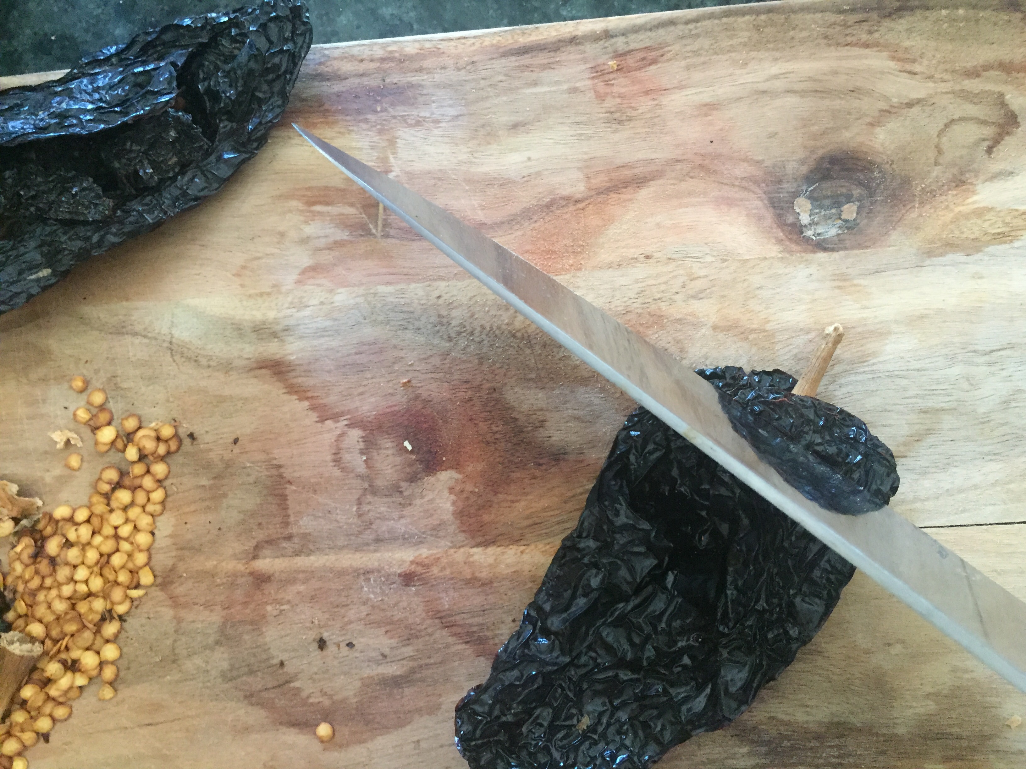 • 6 dried chilis. I used 4 ancho and 2 pasillas, stems and seeds removed. You want these to be pliable not brittle. Almost the texture of a firm raisin. If they are crumbly the flavor will be less intense, more bland.