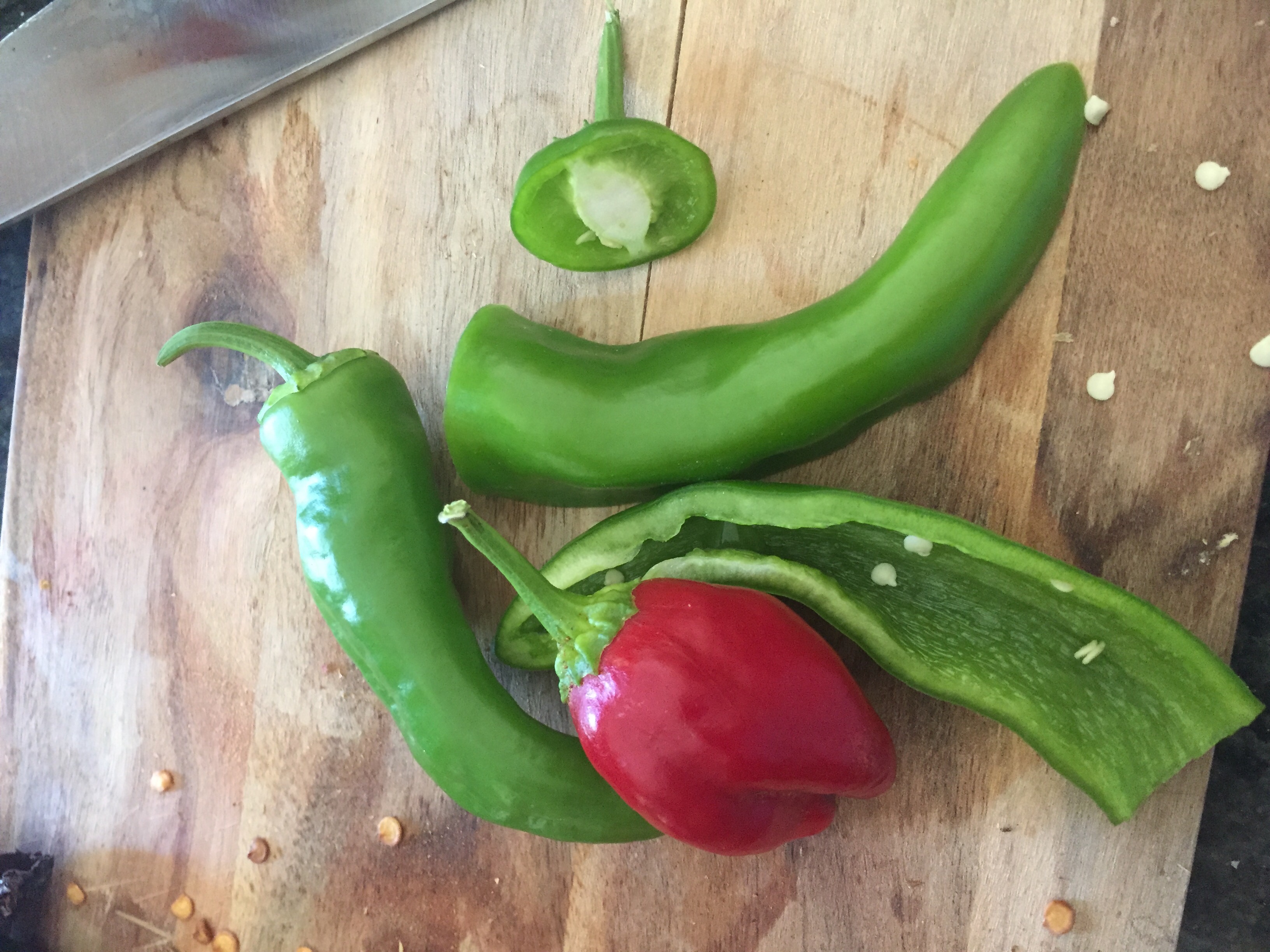 • 3-5 fresh chilis. Jalapeños would be fine, but I used what was in my garden. I had a couple small red chilis and a couple Anaheim chilis, stems and seeds removed.
