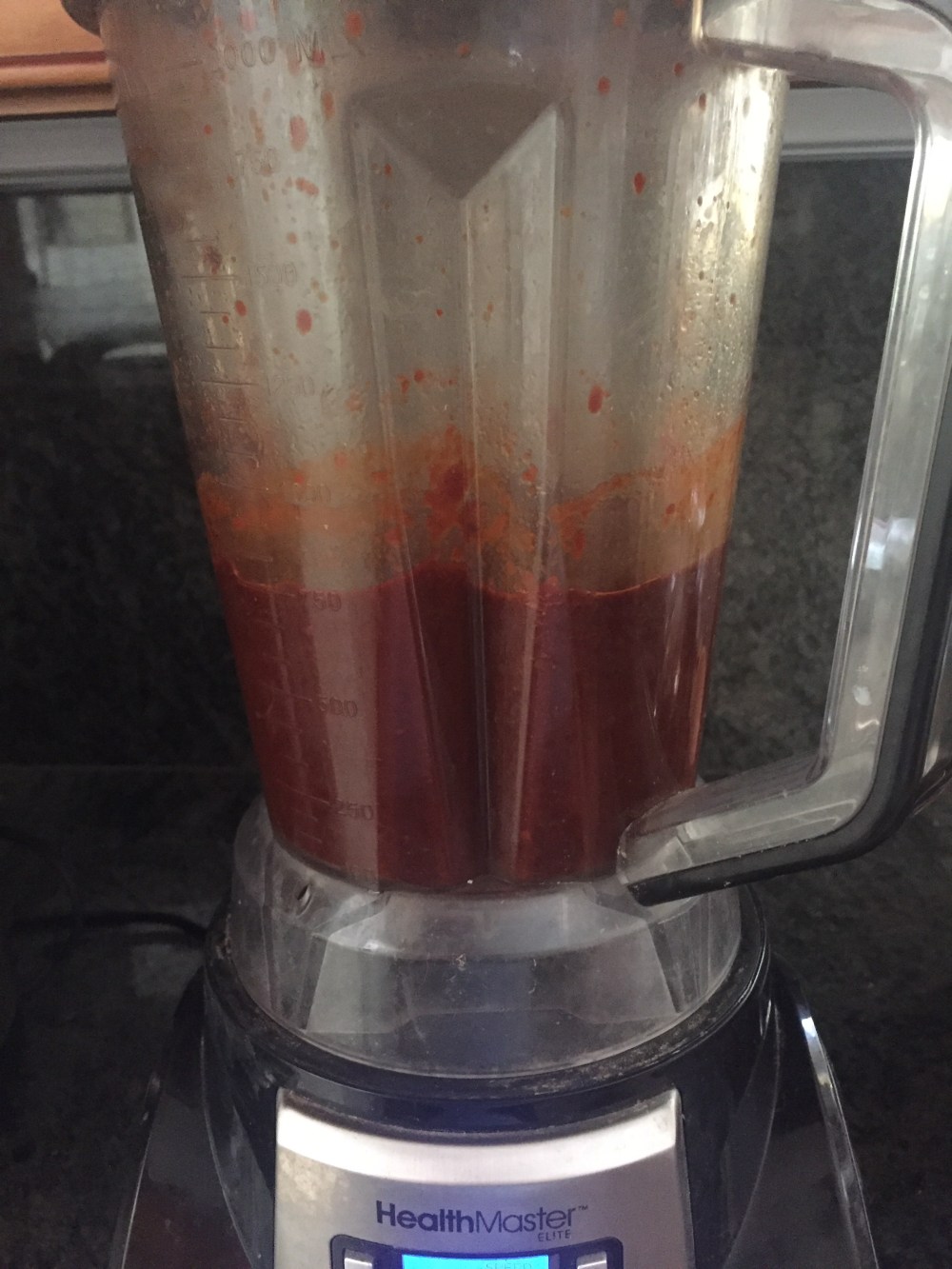 5. In a blender, add chilis and their soaking liquid. Blend until smooth. This will be a rich dark sauce and will be the magical part of this dish.