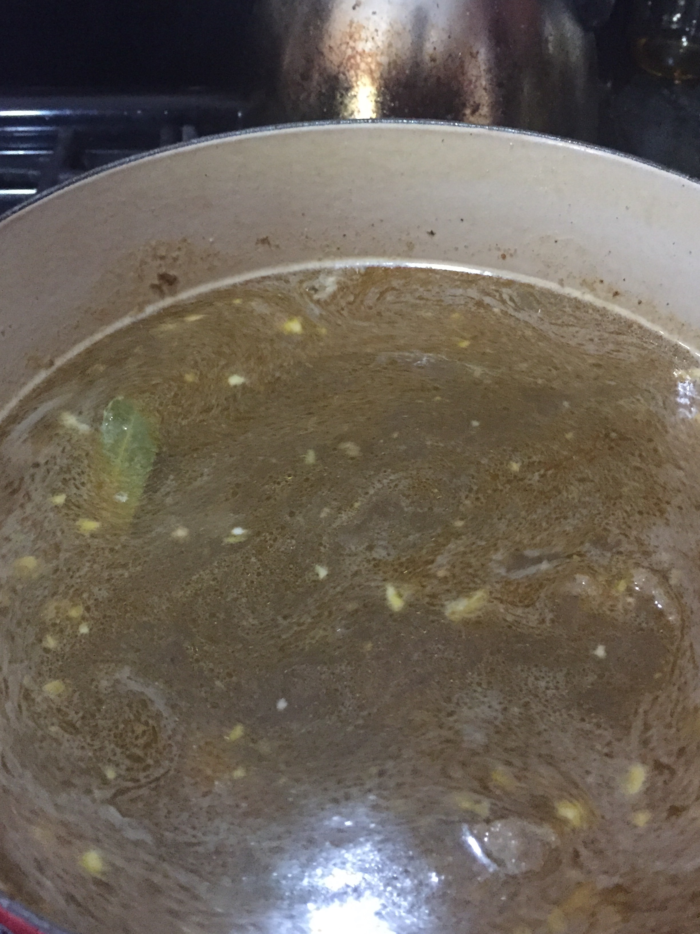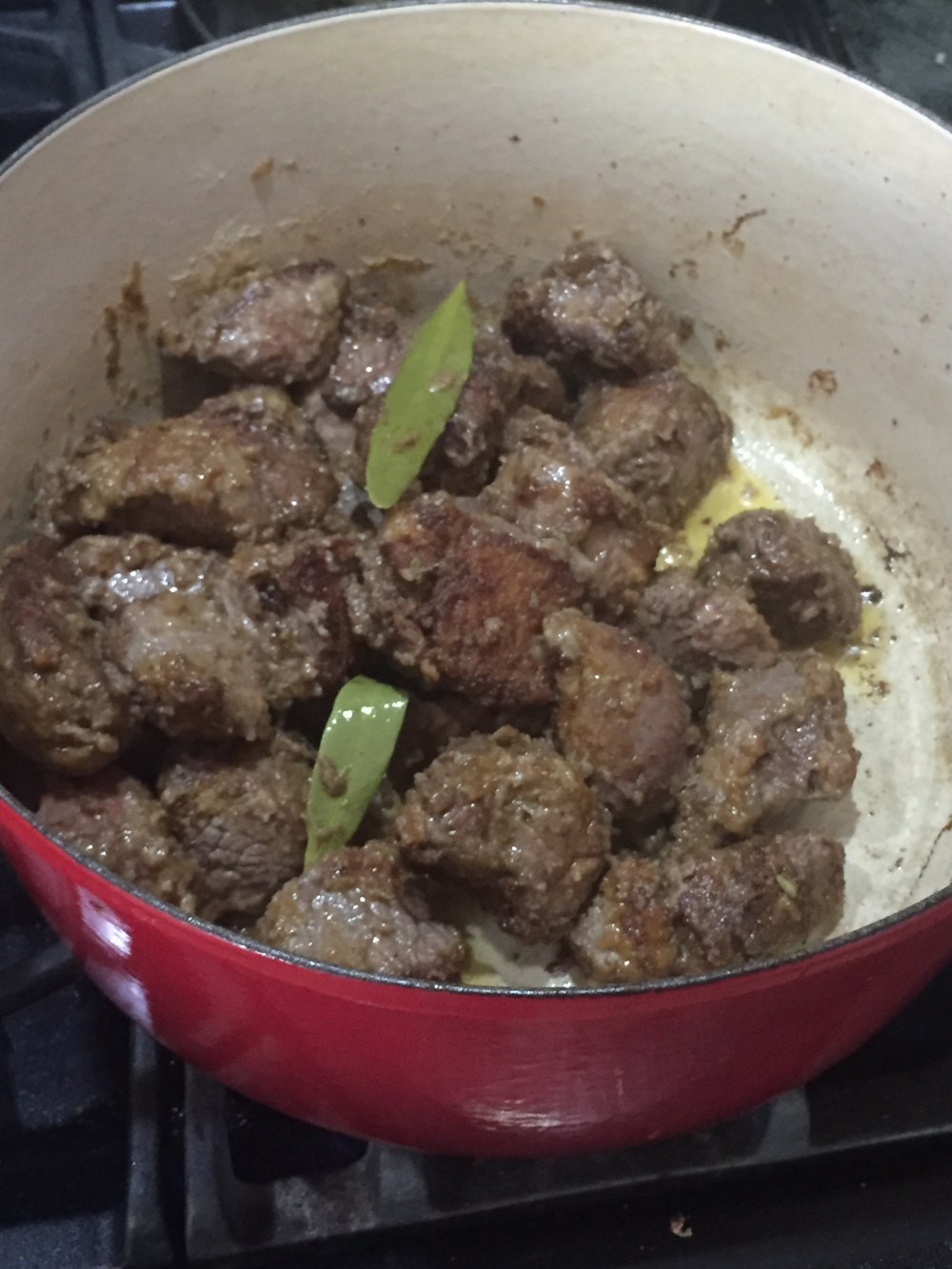 4. Add meat to the oil and brown it on all sides. Once browned, cover with remaining stock. Add bay leaves and remaining seasoning. Bring to a boil and reduce heat to a simmer uncovered for an hour.