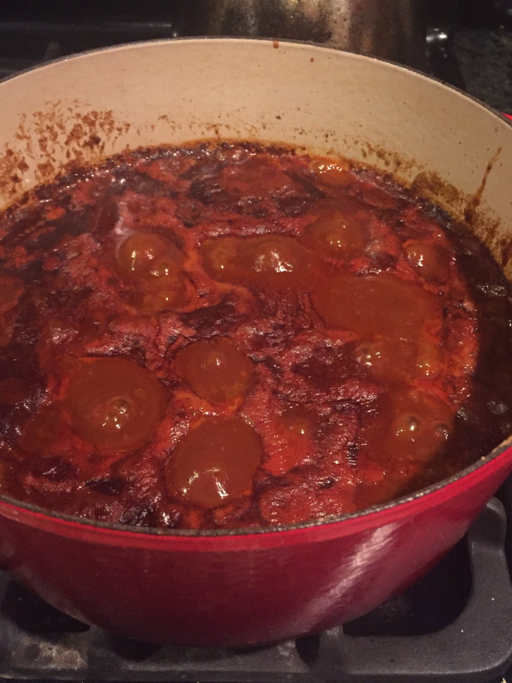6. After an hour has passed, add the chili sauce to the pot with the meat, seasonings and stock. Bring to a boil, reduce heat to a simmer and let cook, this time covered for 45 minutes to an hour. By this time the sauce should be thick, rich and a deep burgundy color. S&P to taste and serve with fresh tortillas, rice, cabbage, whatever makes you happy.