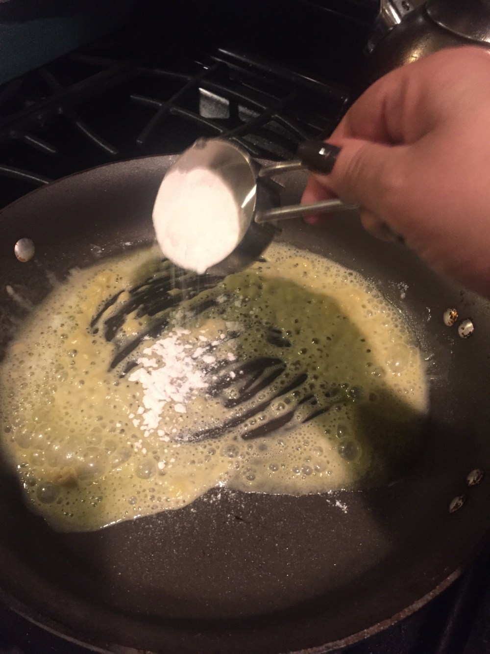 - In a large skillet, melt 1 stick of butter. Add flour to make a basic roux. Start with 1/4 cup and add as needed. You want the butter and flour to cook into a golden color that is the consistency of paste.