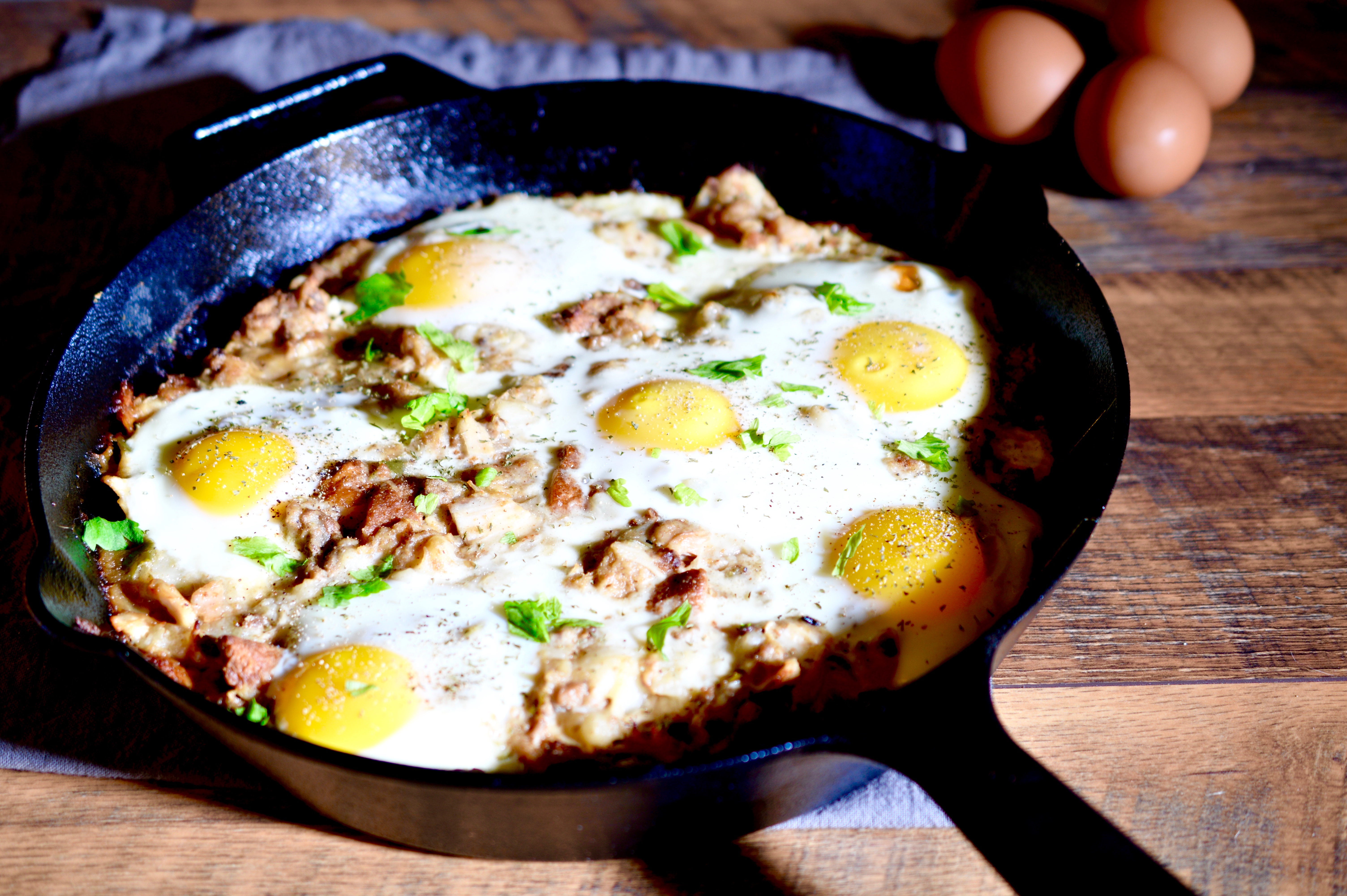 - Pop the skillet into a 400 degree oven and bake just until whites are set. Serve immediately.