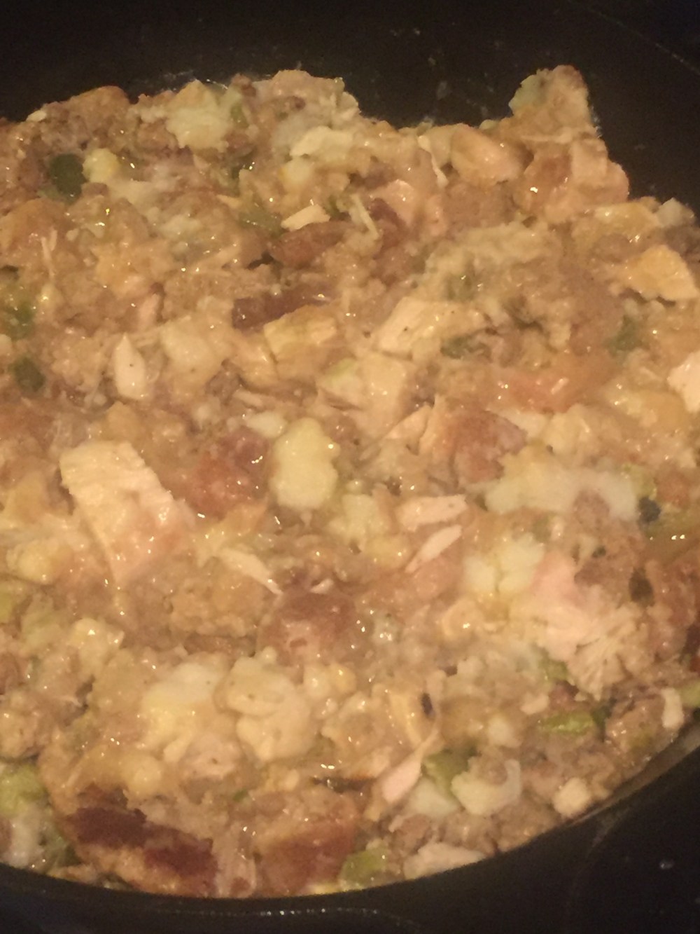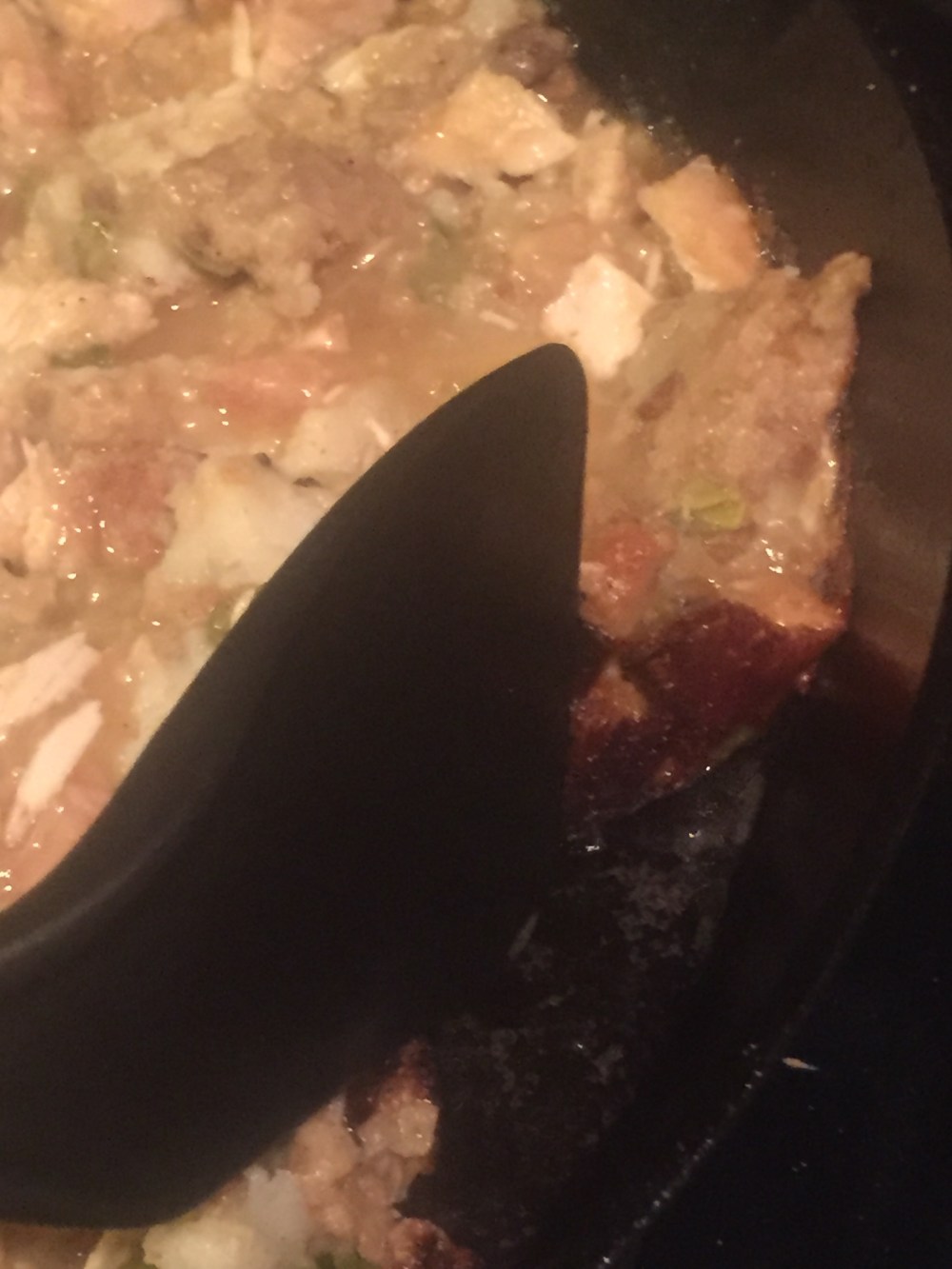This is a “chunk” of gravy! Cold gravy does this! No need to dilute and reheat for this. It will all come together in the skillet.