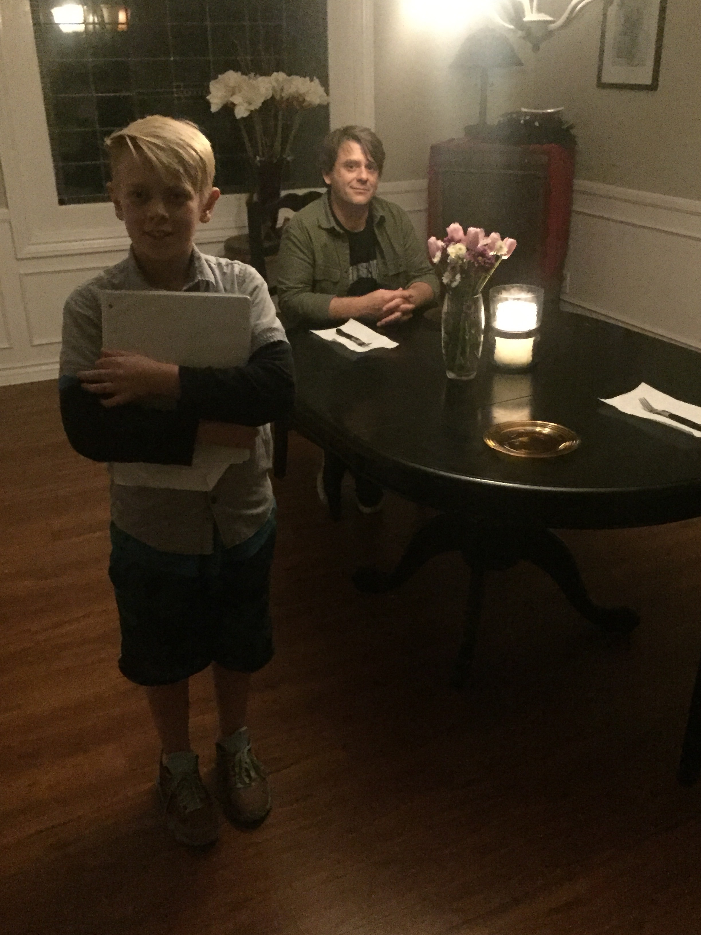We walked into our dining room where I was met with a candle lit, flower filled table and my oldest boy as our waiter.