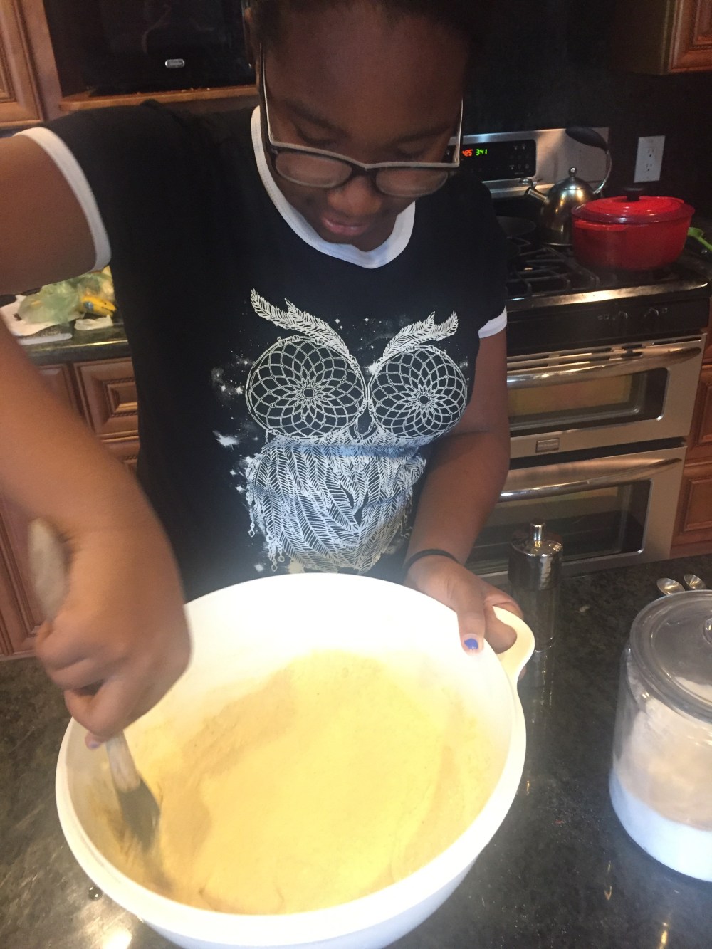 I upped the ante on the cornbread, though! The last few times I’ve made my “go to” recipe, I haven’t been entirely satisfied. So, I made a few adjustments and let me tell you, this shit KILLED. I also had the pleasure of teaching this recipe to my friend Folake’s daughter Nura. It was nice to have an interested kiddo in the kitchen with me 🙂