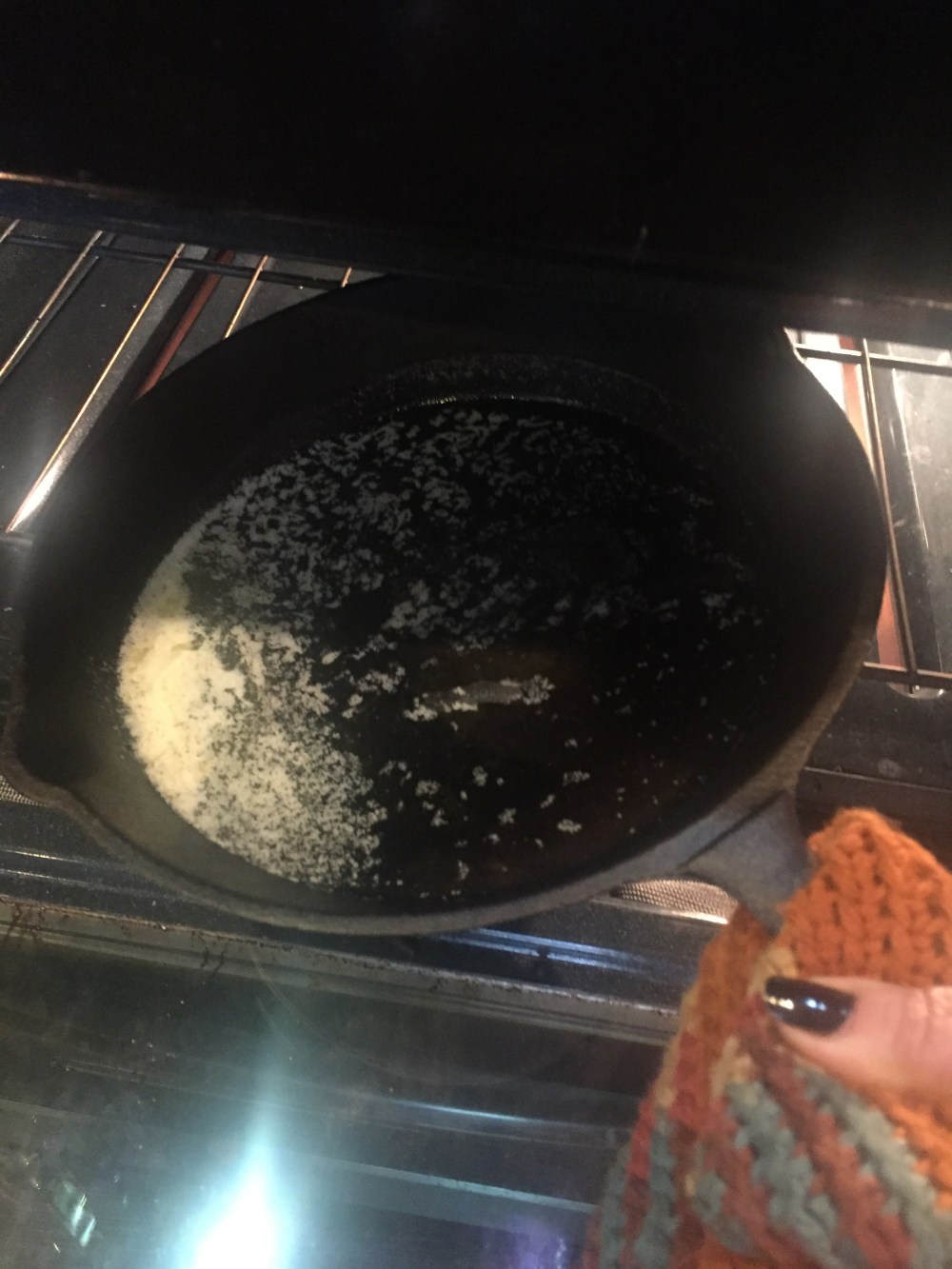 - Add the butter to an 8″ cast iron skillet or an 8″ square metal pan and pop it into the oven until melted.
