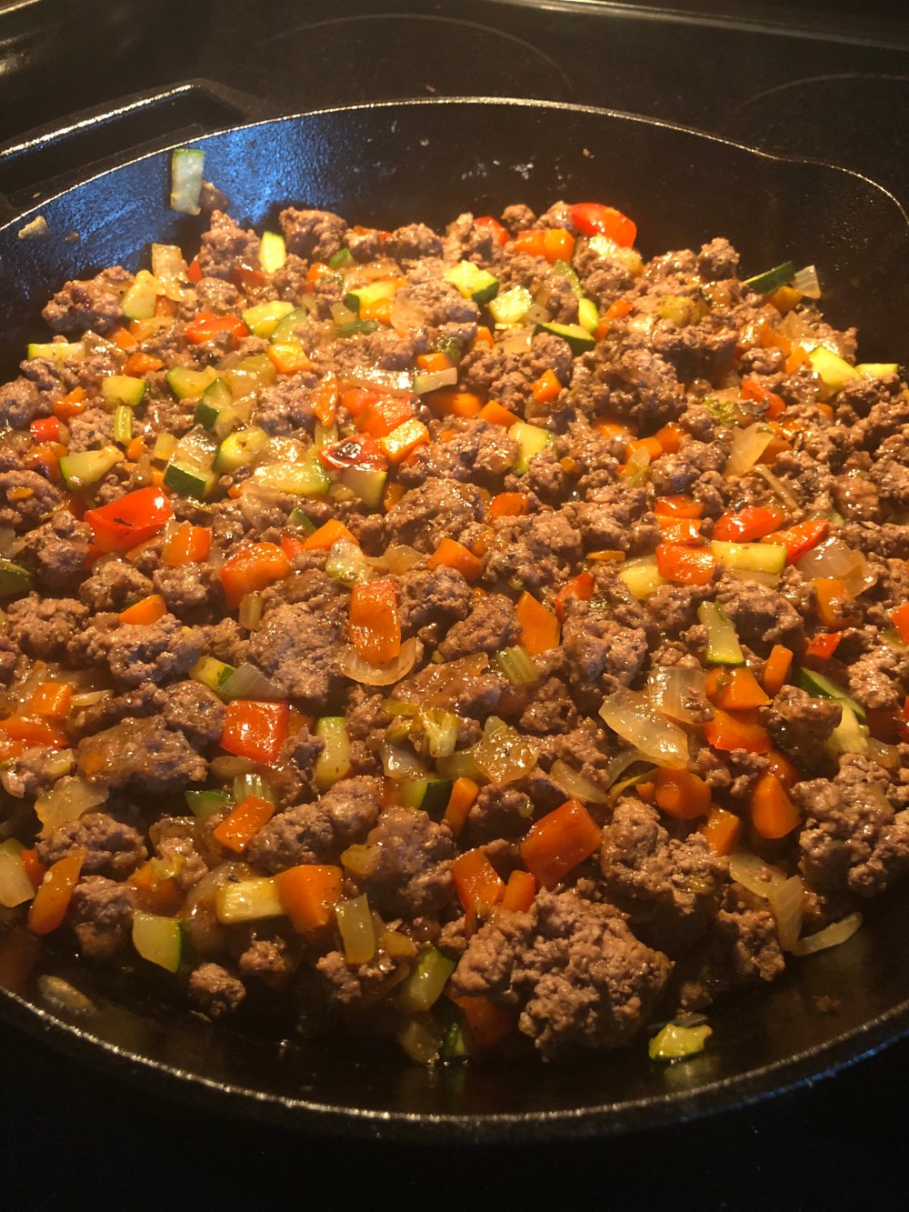 4. crumble ground meat into your veg mixture and start to brown. When your meat is halfway to browned, add in the zucchini.