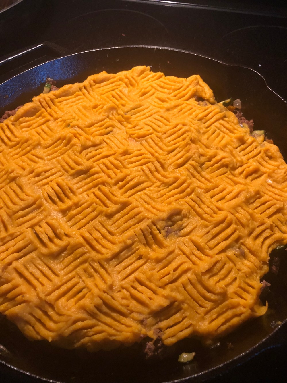 Next, you’re just going to spoon your mashed yams over the top of the meat mixture and smooth it out. I made a design with a fork but I just felt so gottdamned fancy that night! You don’t have to do it 🙂